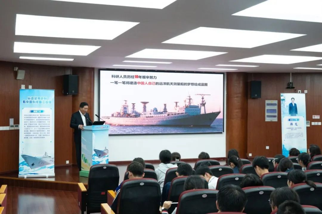 10月12日,高级工程师、中国船舶集团第七〇八研究所党群工作部主任、上海市船舶与海洋工程学会学生和科普委员会副主任韩龙来到了五爱高级中学,从“远望一号”的研制历程讲起,为学生们带来了一场主题为“从船舶科技看海上中国梦”的讲座。