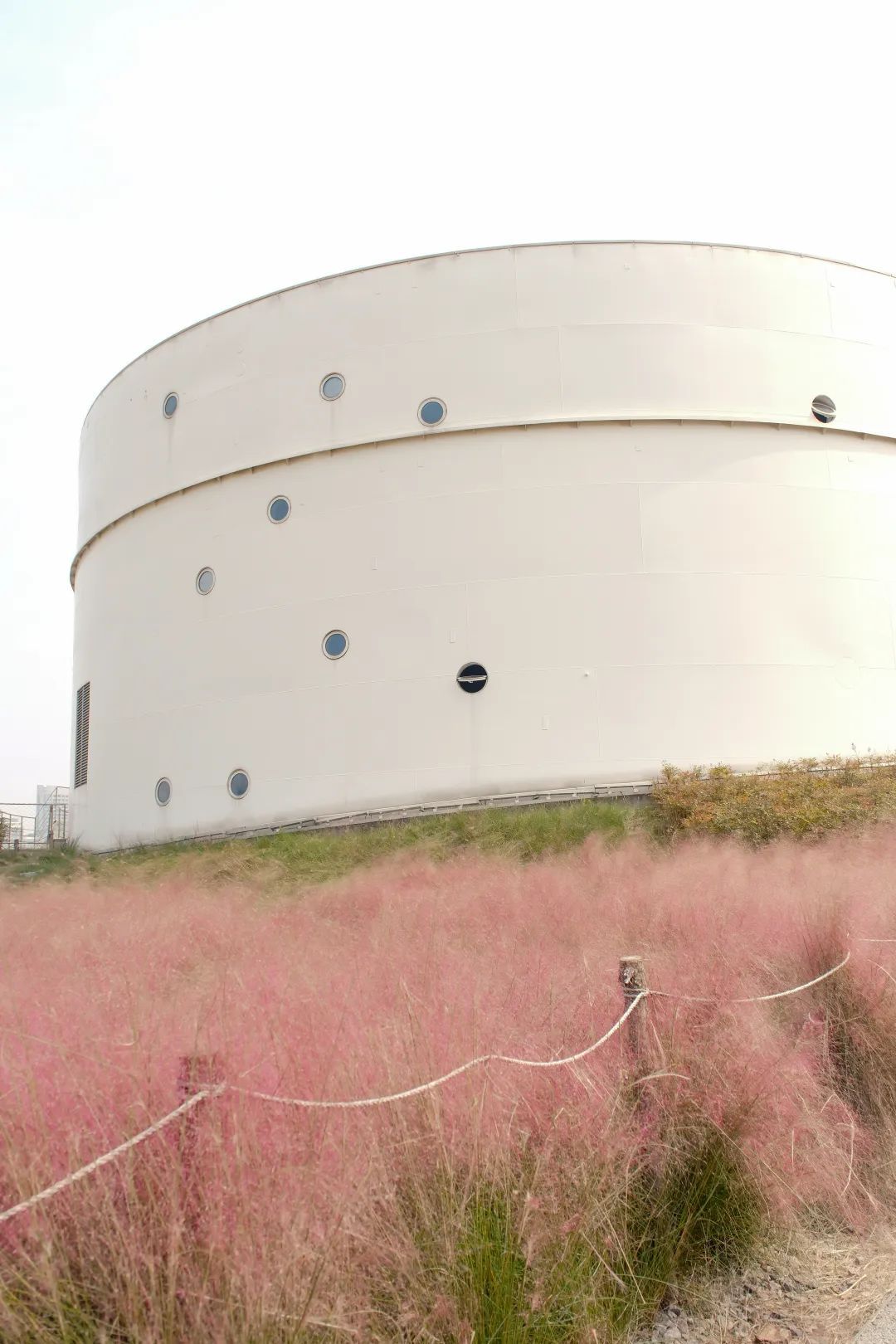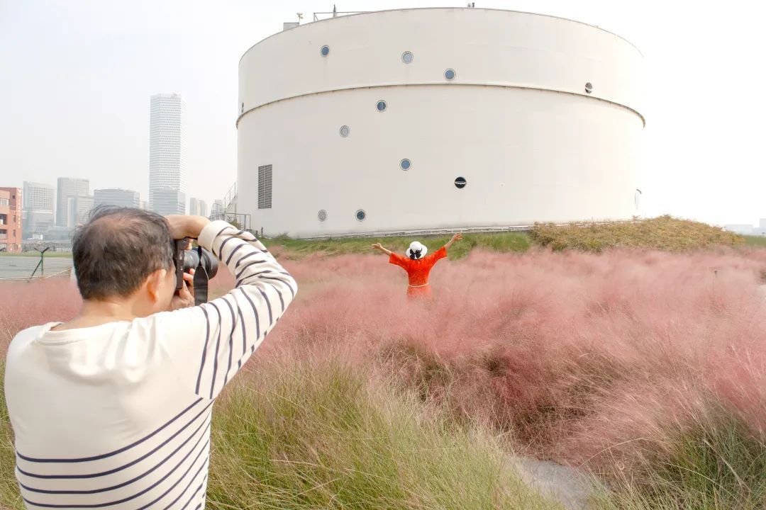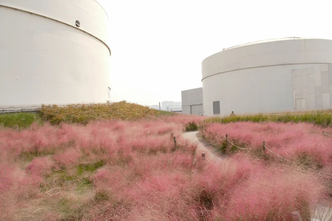 记者来到油罐艺术中心附近,只是刚沿着入口处的小径往里走,就看到临江边一片唯美的粉黛子花海,阳光下,与蓝天白云和周围的白色油罐建筑相映成趣。