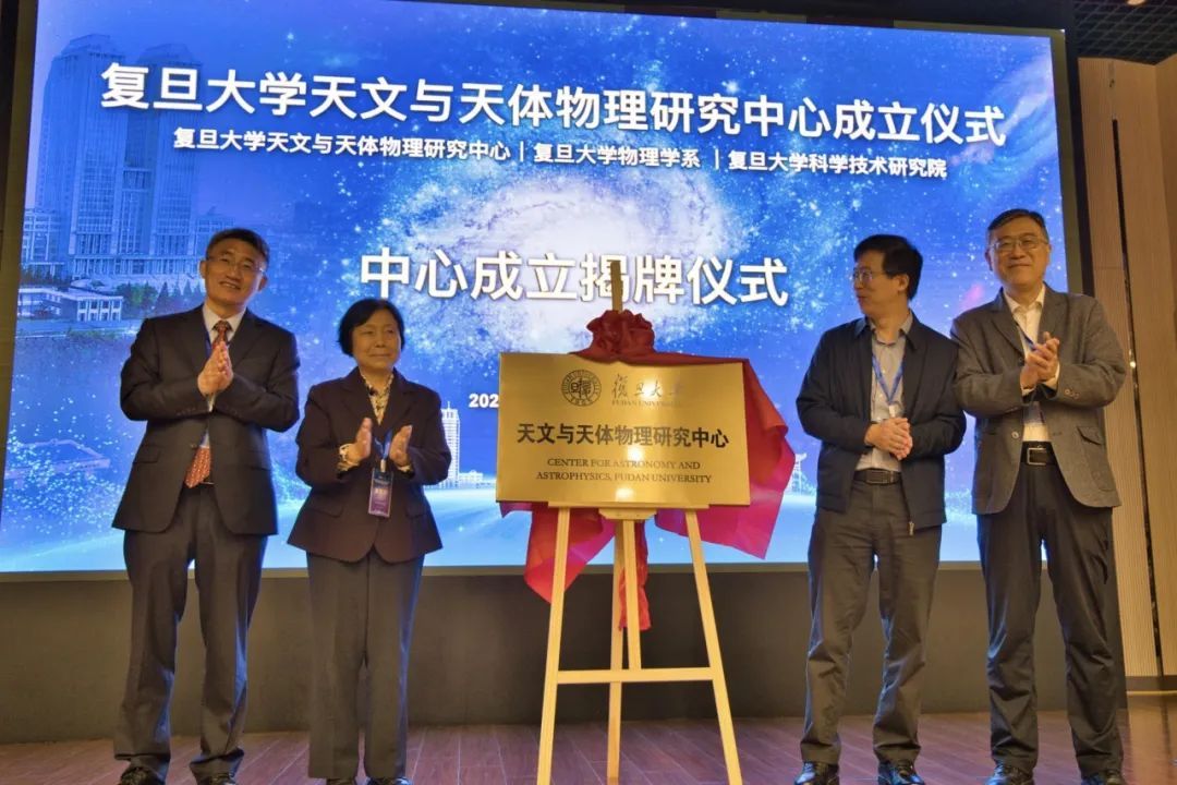 国家自然科学基金委数理科学部副主任倪培根、南京天文光学技术研究所崔向群院士、复旦大学副校长周磊教授、复旦大学天文与天体物理研究中心主任袁峰教授共同为研究中心揭牌。复旦大学科学技术研究院院长彭慧胜院士主持开幕式。