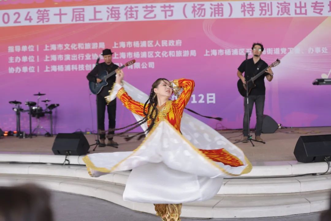 这是上海街艺节开展的杨浦专场演出,街头艺人们带来了极具民族特色的《掀起你的盖头来》《青春舞曲》,还带来一曲大合唱《我和我的祖国》。