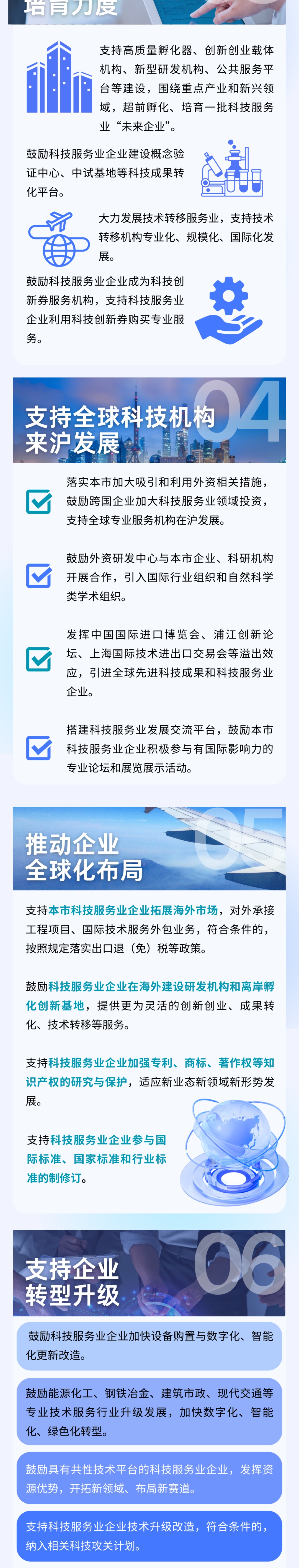同时,为进一步完善支持科技服务业发展政策体系,我市近日出台《上海市加快科技服务业高质量发展的若干措施》。《若干措施》紧紧围绕壮大主体、优化结构、提升能级、强化引导四个方面,提出十条举措,加快我市科技服务业高质量发展,持续强化科技创新策源功能,推动上海国际科创中心建设。详见↓