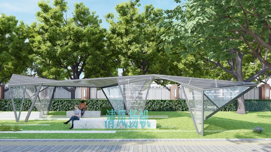 在金都路春光路西南角设置一处“清风扬帆”廉洁文化宣传廊,以“清风徐徐、扬帆启航”为核心理念,彰显具有工业区特色的廉洁文化风尚,是园区企业文化与地方政治生态的交汇点。亭内镌刻廉洁宣传文化标语和企业诚信经营、廉洁从业的企训,汇聚行业正气,共筑清风净土。除此之外,金都路春东路、春光路路口还将设置文明宣传相关公益景观小品。