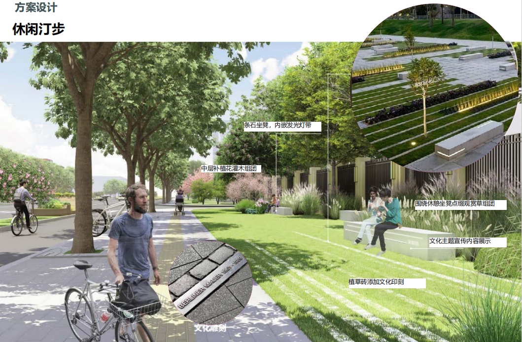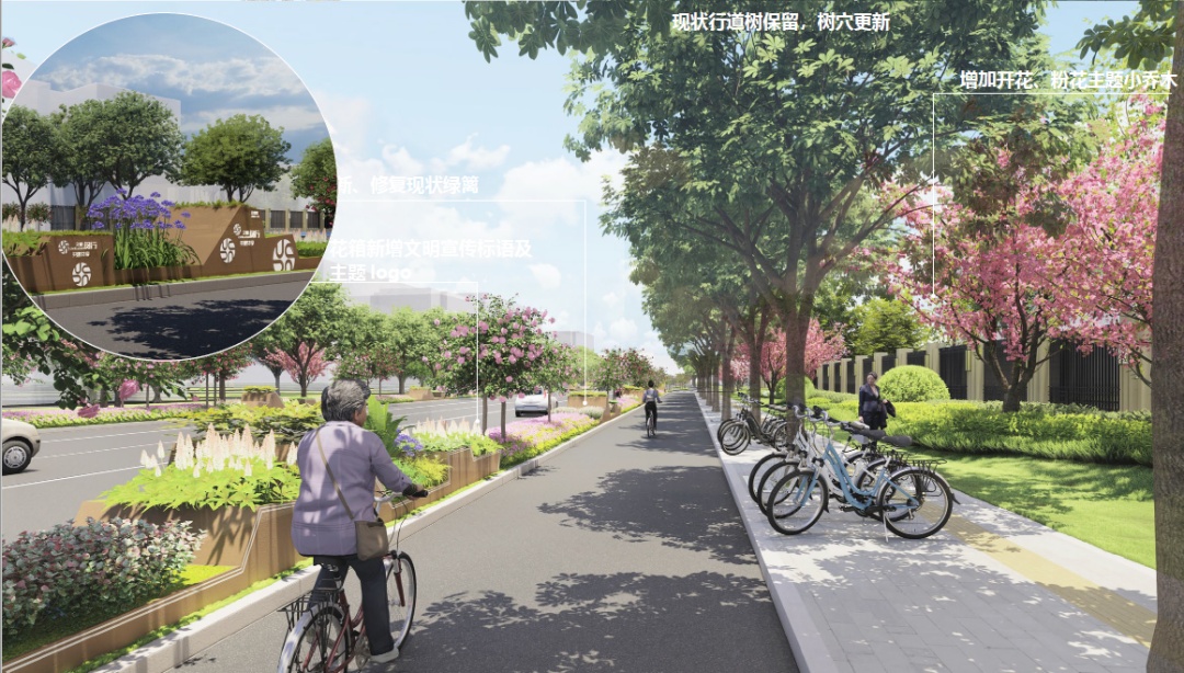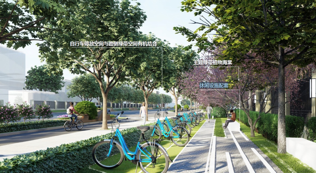 为满足金都路非机动车停车需求,部分点位将新增非机动车停车点,每个停车点配置停车LOGO、条石座凳、植草砖停车区、主题植物,可同时满足停车、休憩、观景需求。
