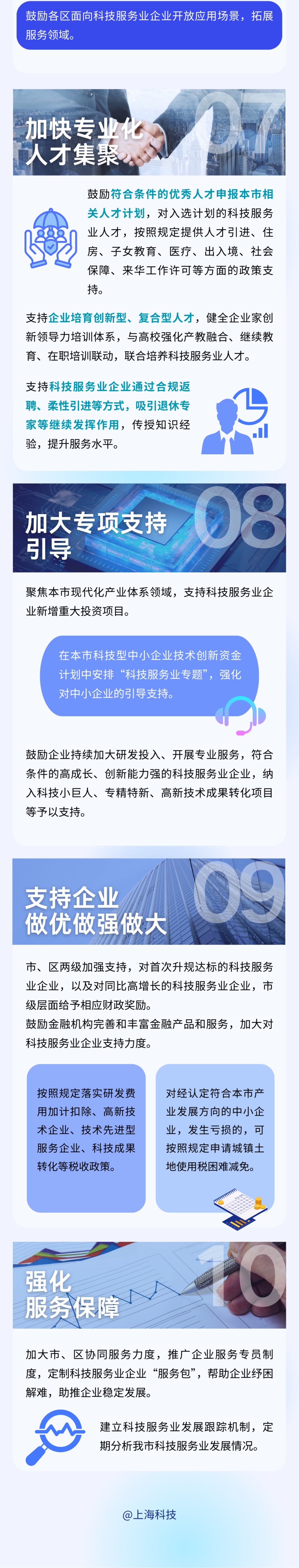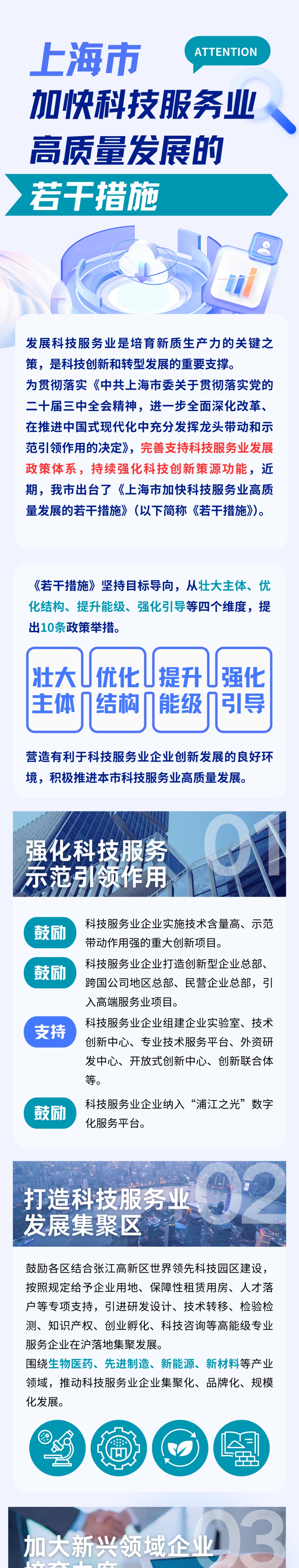 同时,为进一步完善支持科技服务业发展政策体系,我市近日出台《上海市加快科技服务业高质量发展的若干措施》。《若干措施》紧紧围绕壮大主体、优化结构、提升能级、强化引导四个方面,提出十条举措,加快我市科技服务业高质量发展,持续强化科技创新策源功能,推动上海国际科创中心建设。详见↓