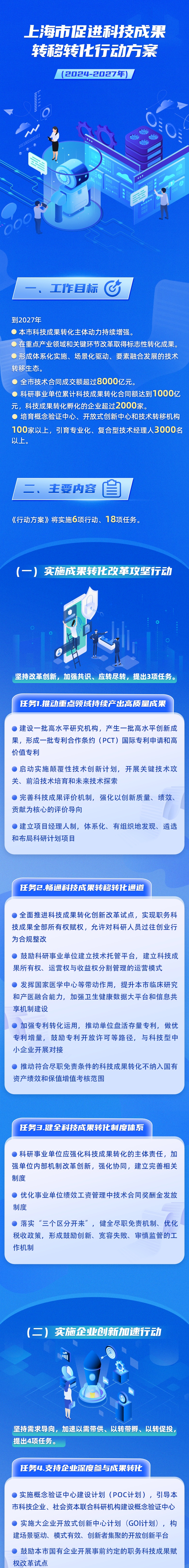 市科委介绍,为进一步提升科技成果转化效能、加快培育发展新质生产力,市政府办公厅近日印发《上海市促进科技成果转移转化行动方案(2024-2027年)》。《行动方案》重点任务提出实施成果转化改革攻坚行动、实施企业创新加速行动、实施技术转移伙伴赋能行动、实施技术经理人专精培育行动、实施技术要素市场联通行动、实施转化生态协同共建行动等6方面18项措施。