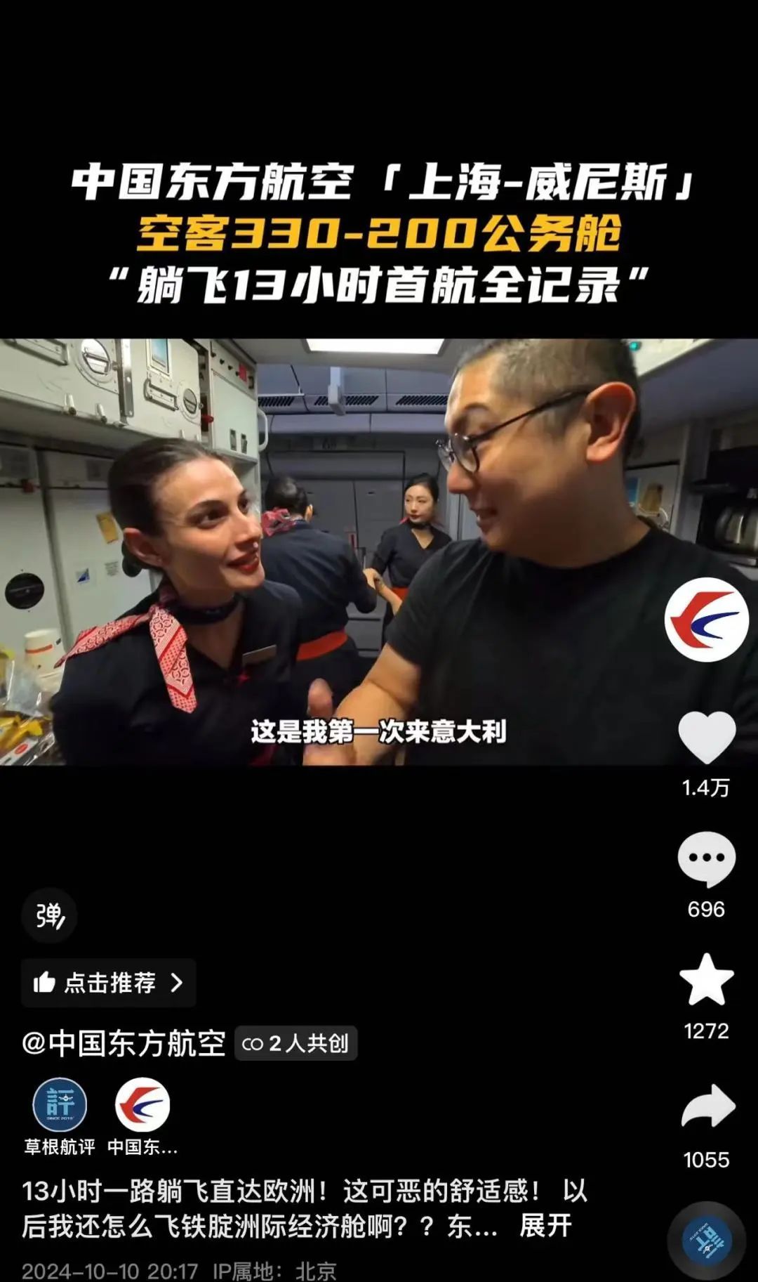 抖音、快手共发布7期内容,总播放量109万。其中“13小时一路躺飞直达欧洲!东方航空MU785上海首航威尼斯航班全记录”收获了大量关注、互动与点赞。