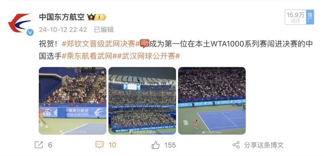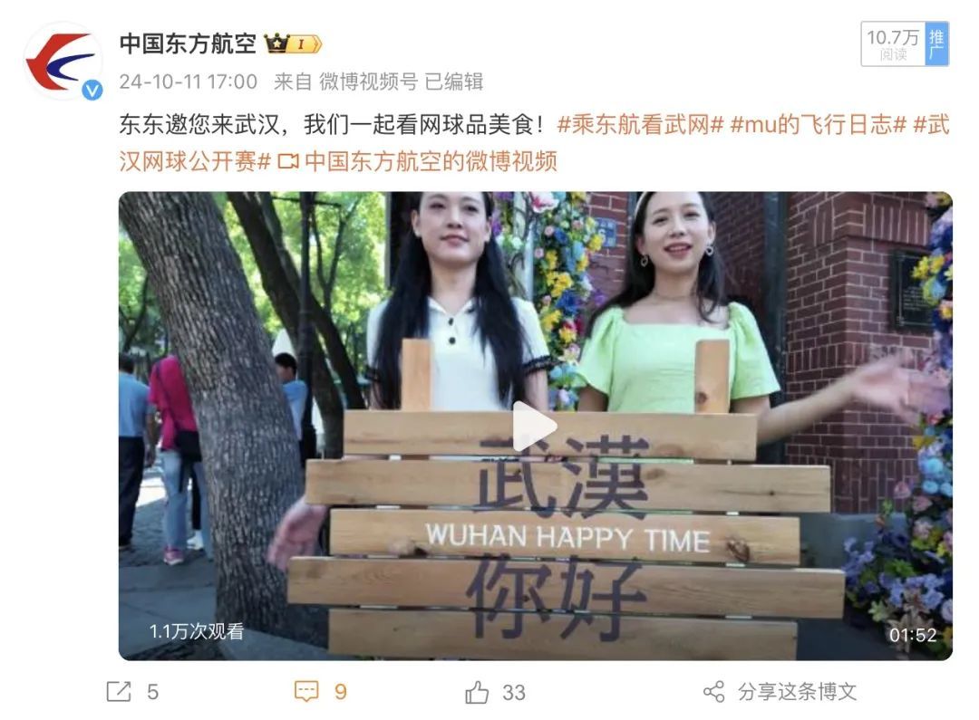 微博共发布23条内容,总流量134万。其中,“祝贺!#郑钦文晋级武网决赛#成为第一位在本土WTA1000系列赛闯进决赛的中国选手”、“东东邀您来武汉,我们一起看网球品美食!”、“来看飞行员是怎样‘练’成的?”获得了更多的曝光量。