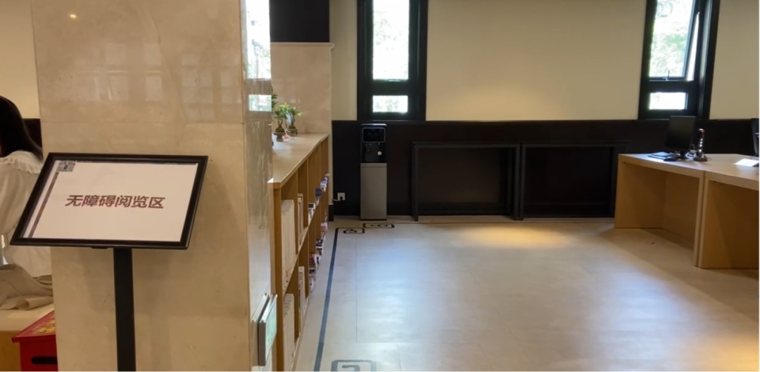 无障碍阅览室:以不破坏原优秀历史建筑地面为原则,重新规划设置50平方米无障碍区域,增设提示盲道,以及无障碍阅览区域盲文指示牌。该区域配备有声读物设备,供视弱人士阅读的电脑等仪器。新增大字读物、盲文读物和可提供语音、大字功能的信息检索设备、低位饮水机。为了进一步提升图书馆无障碍环境建设,图书馆在无障碍阅览区域还增设轮椅停留位2个,低位书架2个,充分保障残障人士、老年人的权益。