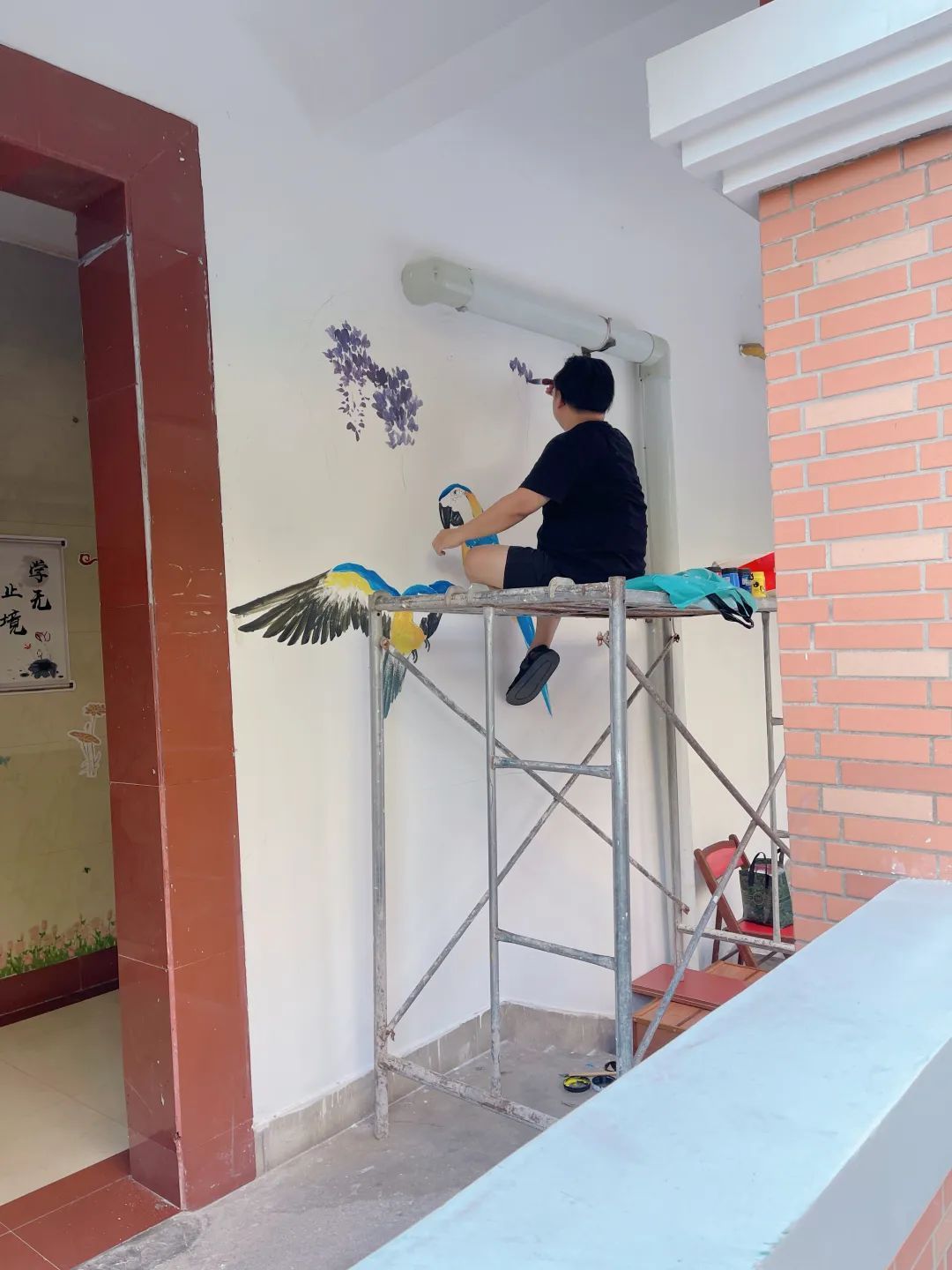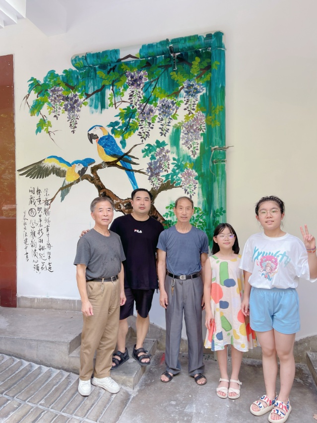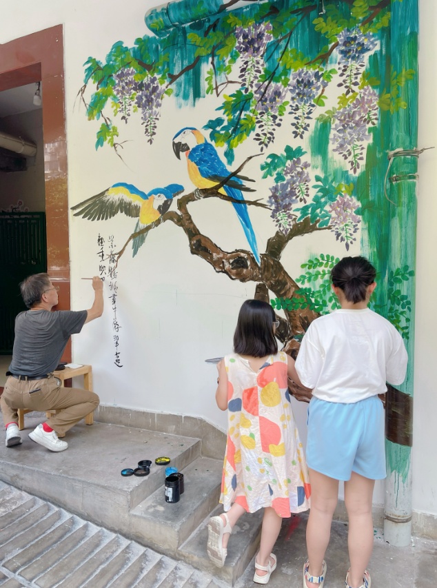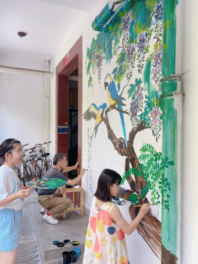 与此同时,在楼组党员的带领下,居民们积极参与,共同讨论画面立意,最终选定将原本光秃秃的墙面变为寓意吉祥、风格雅致的国画紫藤鹦鹉图。
