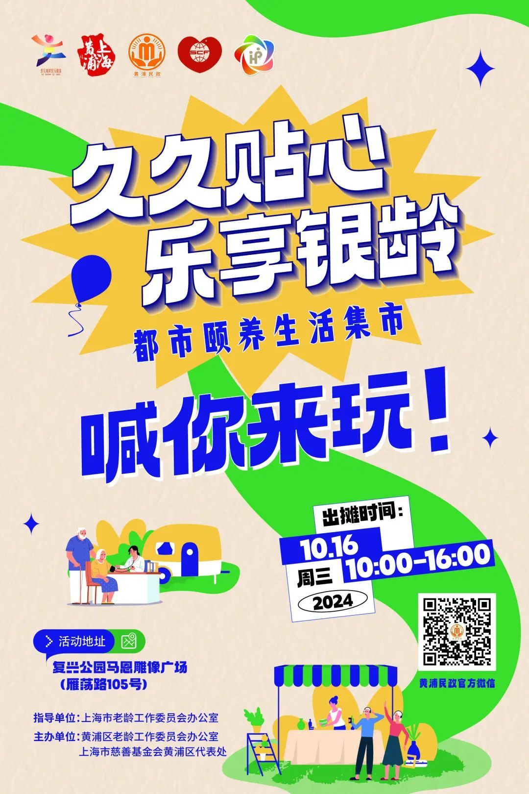 2024年黄浦区敬老月活动正在持续开展,作为其中的一项重要内容,“久久贴心,乐享银龄”都市颐养生活集市将于10月16日10点—16点在复兴公园举行,届时欢迎广大市民和老年朋友前来参加体验。