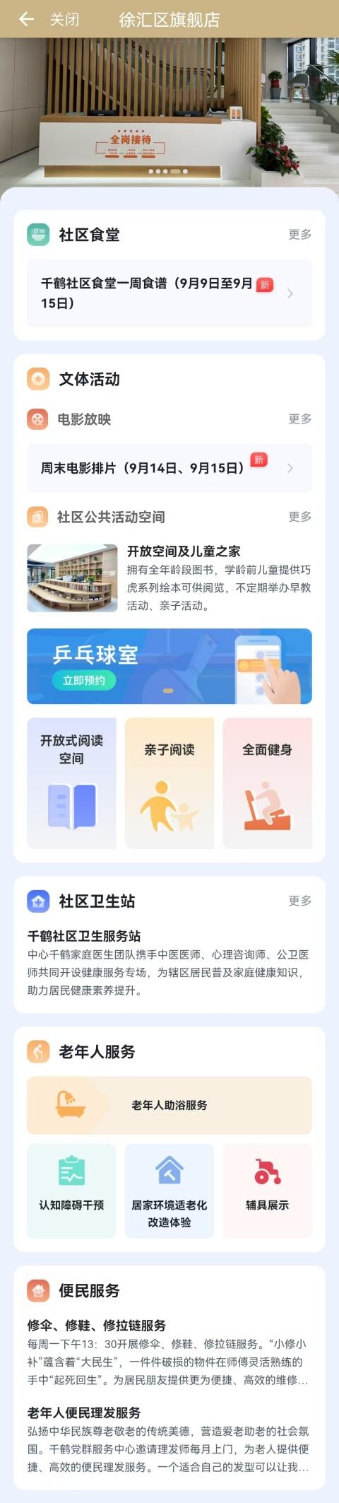 除了乒乓球室的预约,在平台上还可以查阅到千鹤社区食堂的一周菜单、邻里汇周末电影放映安排,获取便民维修及老年人理发等服务信息,“解锁”社区卫生站、老年人服务、亲子阅读等更多有趣、丰富的“生活盒子”内置功能。据悉,田林街道将继续利用数字平台,提升社区服务的覆盖面和质量,力争为社区居民打造一个更便利、更温馨的社区生活空间。