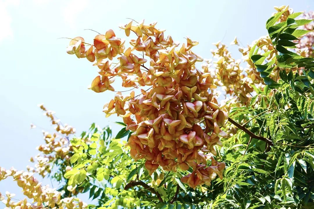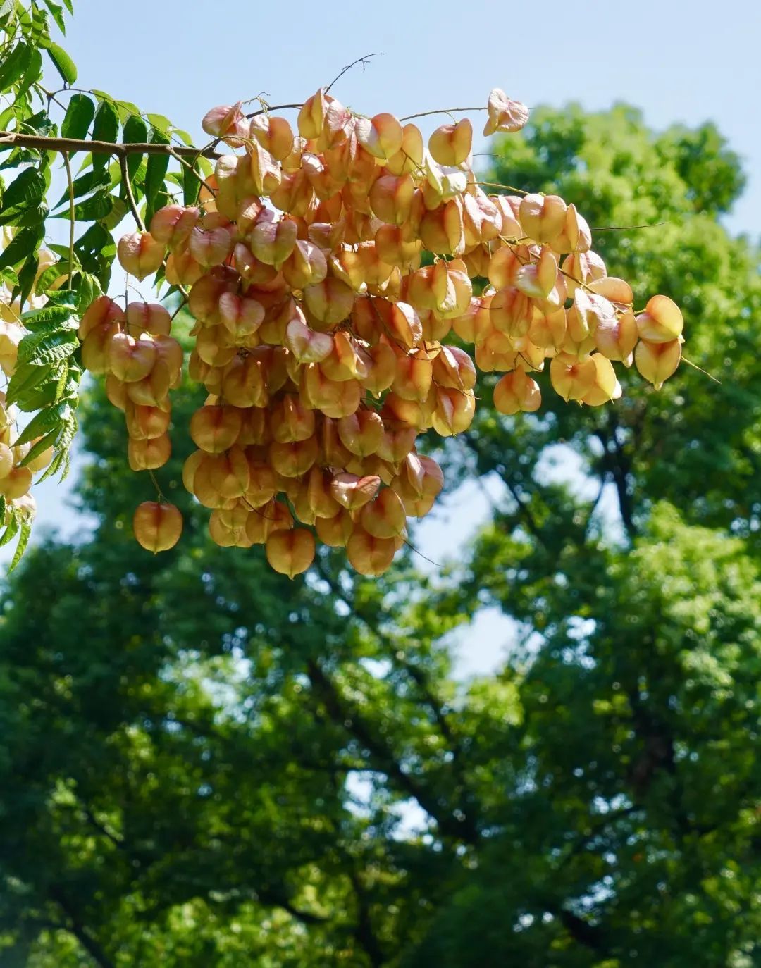 栾树从夏天开花到秋天结果,观赏期长达一个多月。”栾树的花语为“奇妙、震撼,绚烂的一生”。它的流光溢彩构筑起了这个秋日里不可多得的风景线,路上看到掉下来的果实和花朵,可以拿回家晒干用来装点房间也是别有意趣。