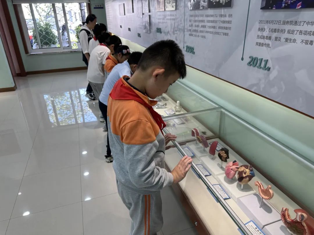 在禁毒社工的带领下,学生们井然有序地参观了社戒社康指导室的主题展厅,首先回顾了中国百年禁毒历程,通过“宝山区禁毒工作组织架构”“宝山禁毒工作成效”,以及“禁毒关乎民族存亡”的展示,直观地感受到了禁毒工作的复杂性和艰巨性。