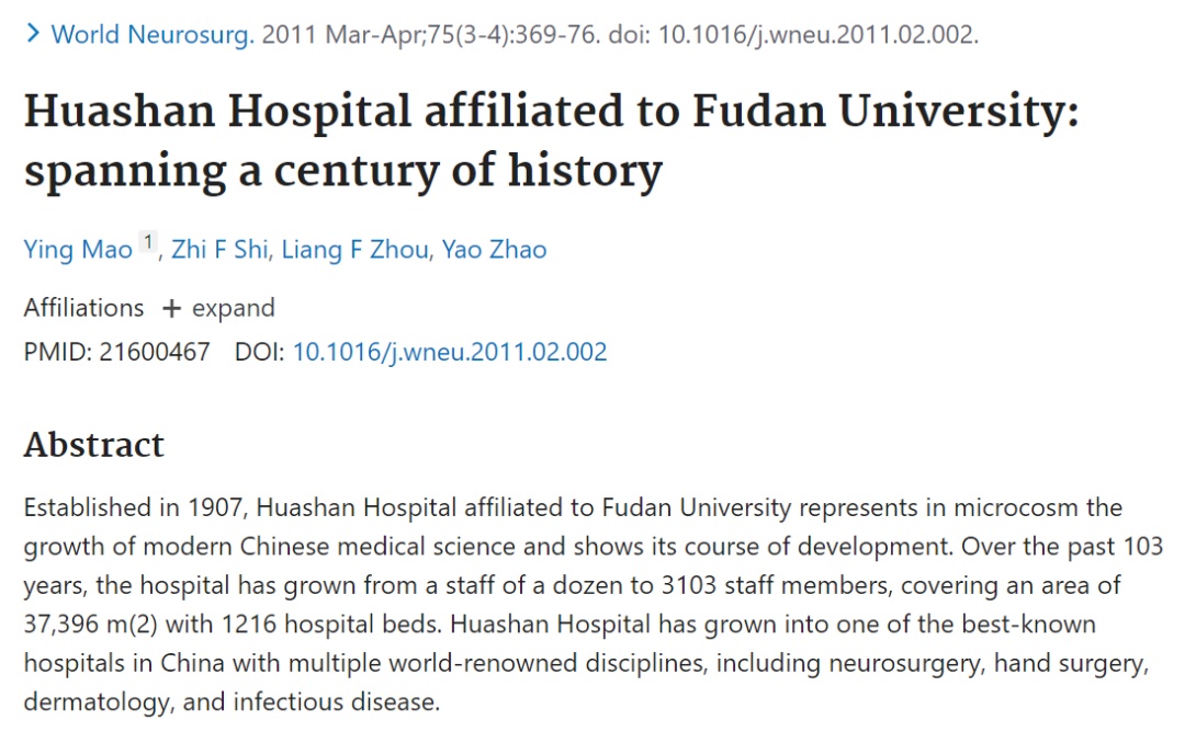 我当时受科室委托写的一篇介绍我们华山医院,特别是介绍神经外科的文章,是2011年发表在World Neurosurgery上面的。写这篇文章,就不得不提我和史教授之间的一个很有意思的故事了。