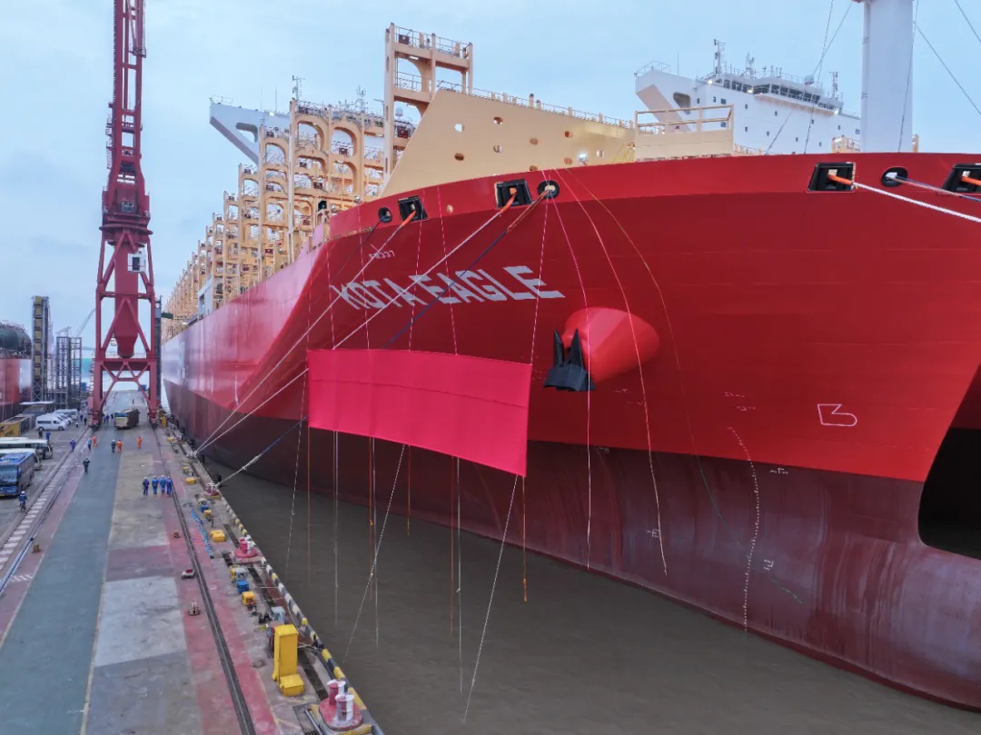 礼花点缀下,江南造船为新加坡太平船务建造的14000TEU LNG双燃料集装箱船系列船首船及第二艘船分别被命名为“KOTA EAGLE(鹰城)”“KOTA EMERALD(翠城)”,其中,“KOTA EAGLE(鹰城)”于当日签字交付。