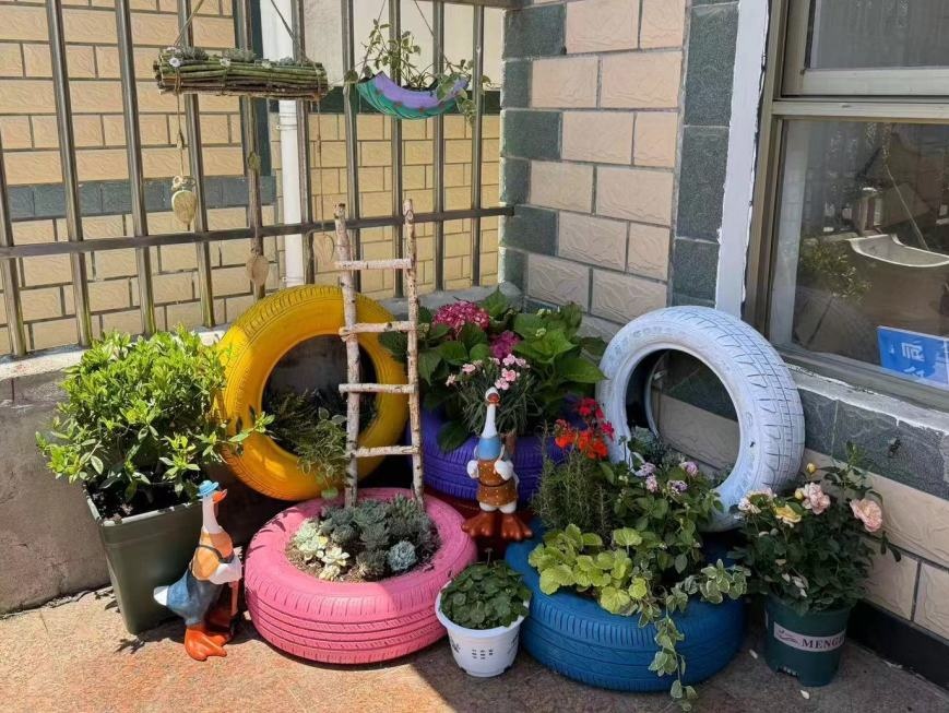 租户叶大哥通过一番巧思,搭配上充满童趣的小摆件,将一个个废弃轮胎摇身一变,成为色彩绚丽的花盆。“轮胎花圃”中小巧的多肉向阳生长,娇艳的绣球迎风绽放。在这一方庭院里,环保不再是遥不可及的大道理,而是通过“变废为宝”,将理念融入日常的点点滴滴。
