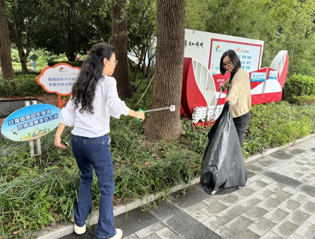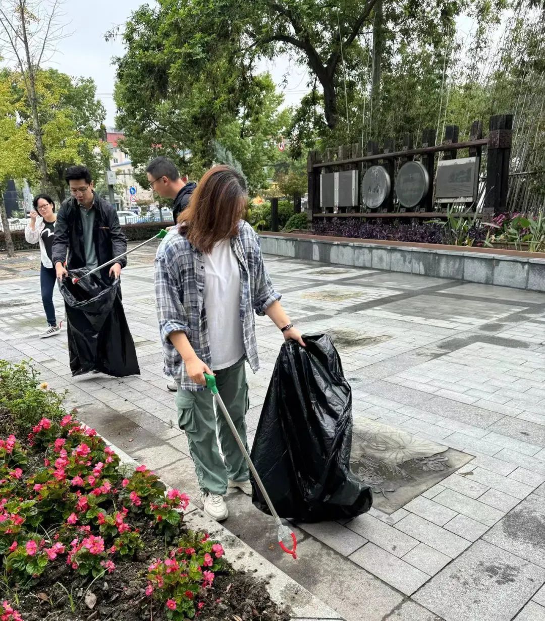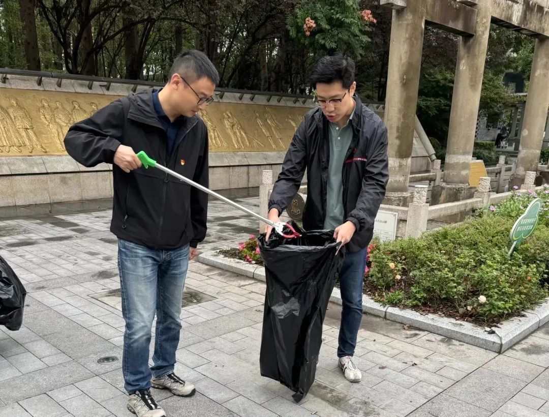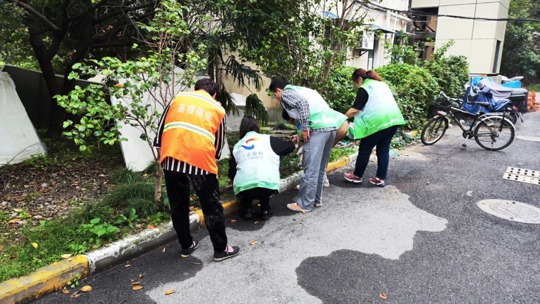 高境经济发展有限公司党支部的党员志愿者们携带火钳、垃圾袋等工具,拾捡地上和绿化带中的烟头、纸屑、果皮等垃圾,改善城市环境质量,美化居民居住环境。