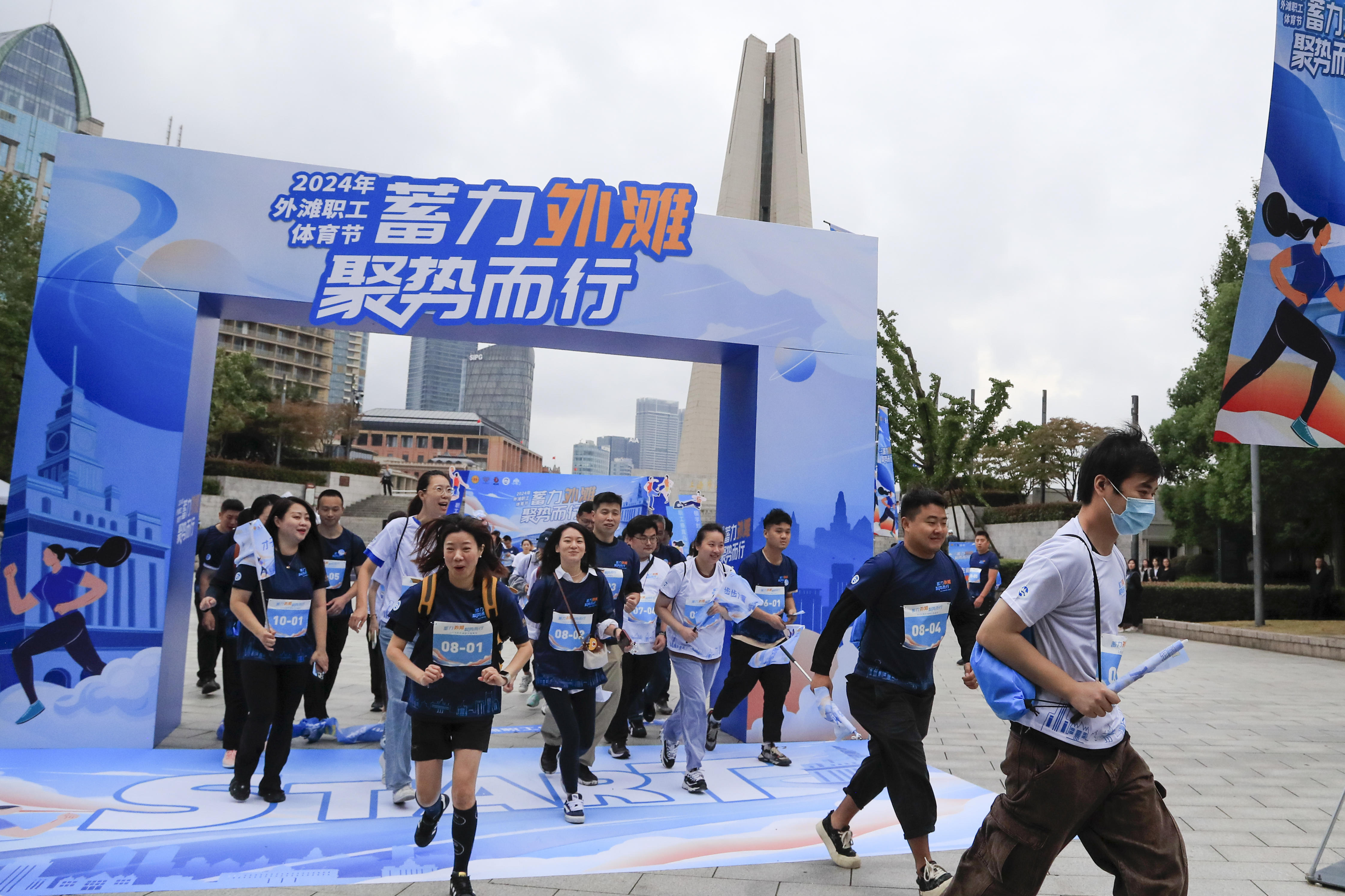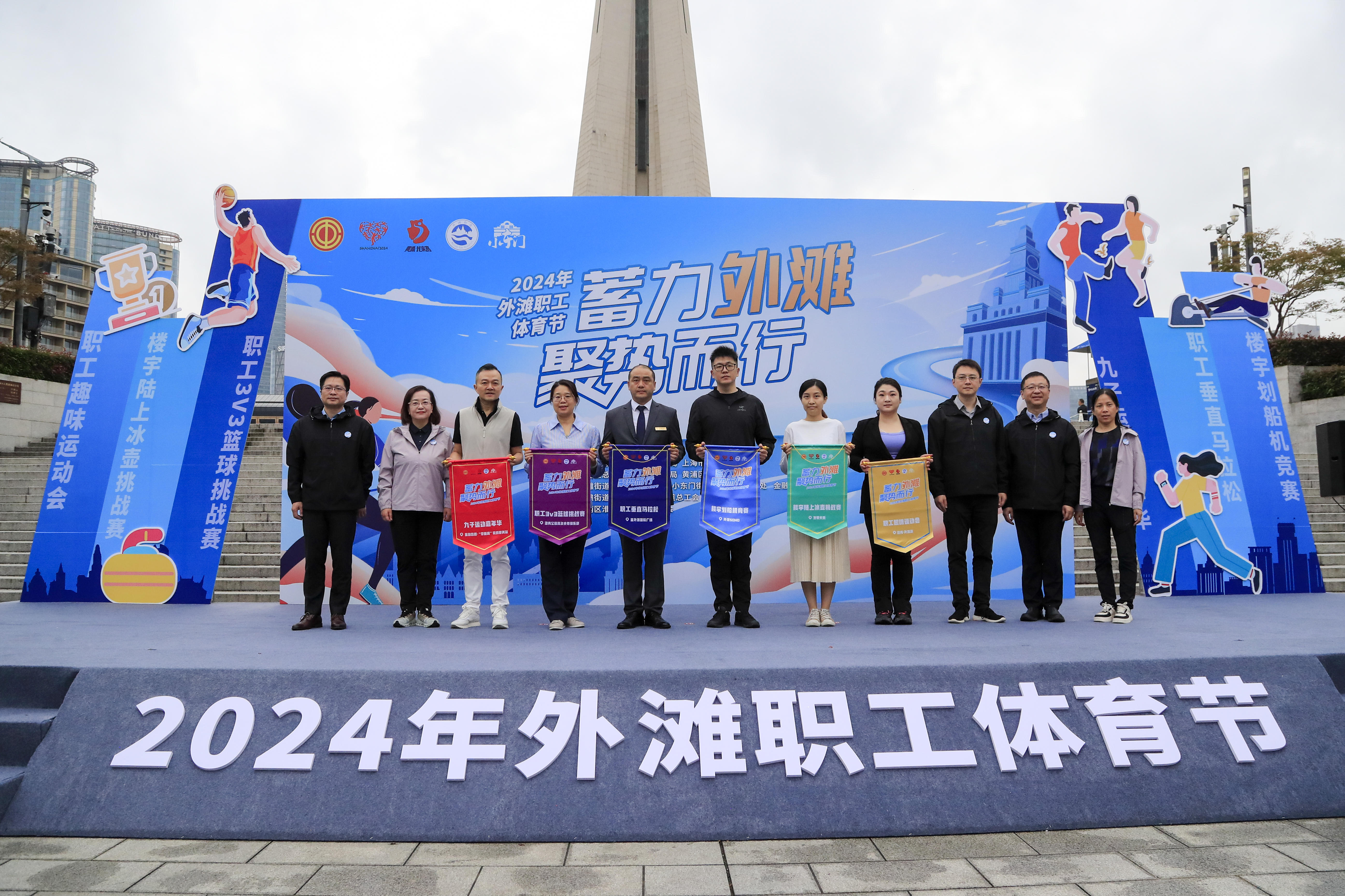 黄浦区总工会党组书记、常务副主席董磊,黄浦区体育局局长潘敏虹,黄浦区城市更新推进办主任杨连娣,外滩街道党工委书记丁琦宁,小东门街道党工委书记包童斌为六场分站赛的楼宇代表授旗。
