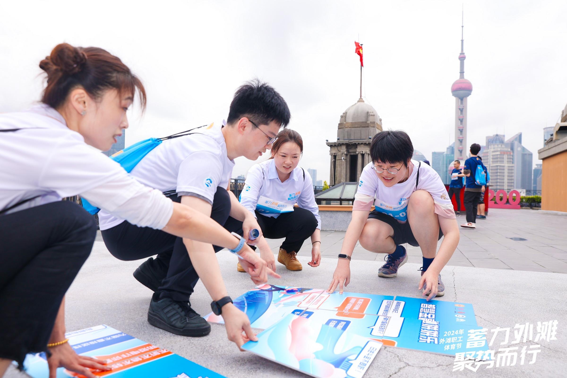 在各个点位,参赛者们完成了包括“智慧金融拼拼乐”“工会历史知多少”“趣味足球”和“运动‘转转转’大挑战”等互动游戏并和沿途地标合影打卡。赛事不仅考验了参赛者的团队协作能力,也展现了外滩职工的活力与智慧。经过激烈的角逐,所有参赛队伍均顺利完成了比赛,并在终点举行了颁奖仪式。