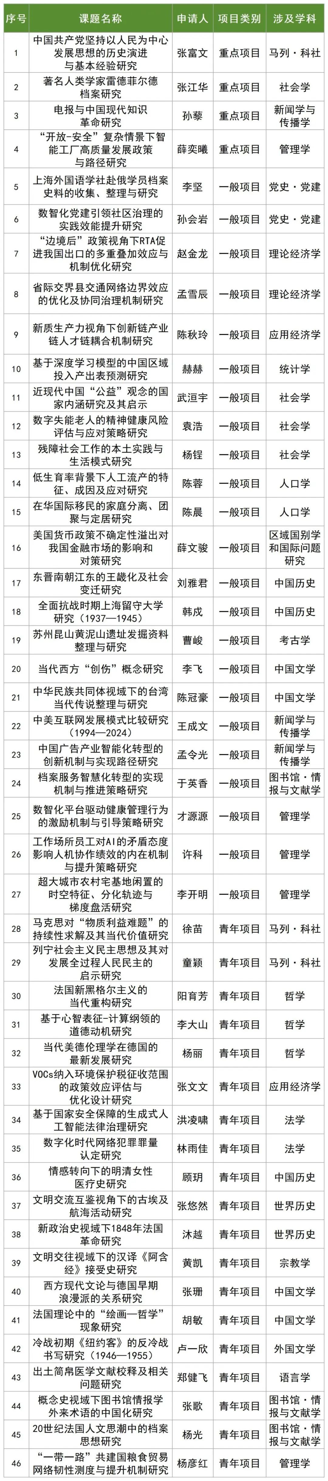 近日,全国哲社办公布了2024年国家社会科学基金年度项目立项结果。上海大学共计46项课题喜获立项,含重点项目4项,一般项目23项和青年项目19项,立项总数较去年增加了10项,再创历史最好成绩。