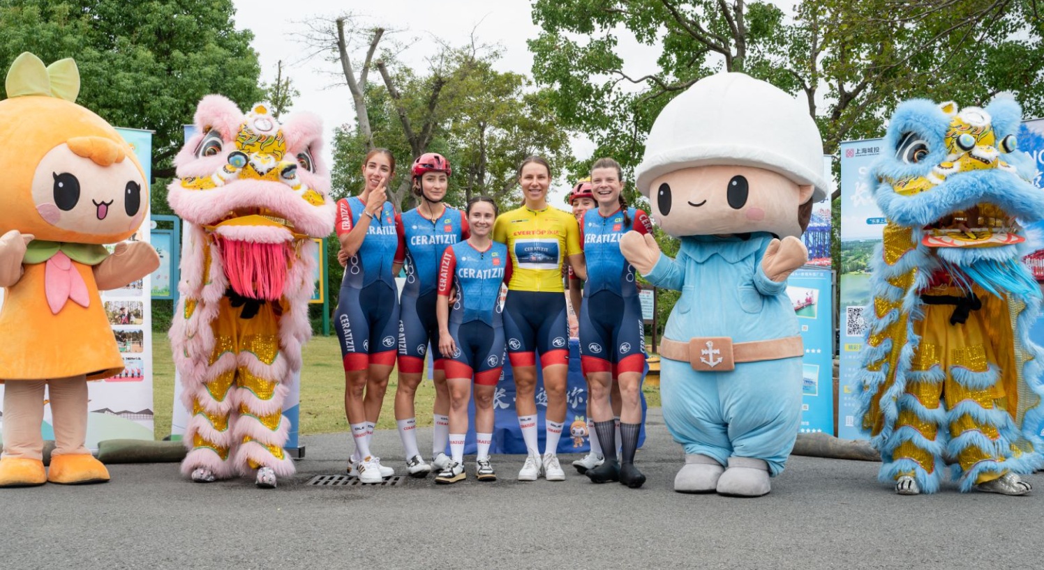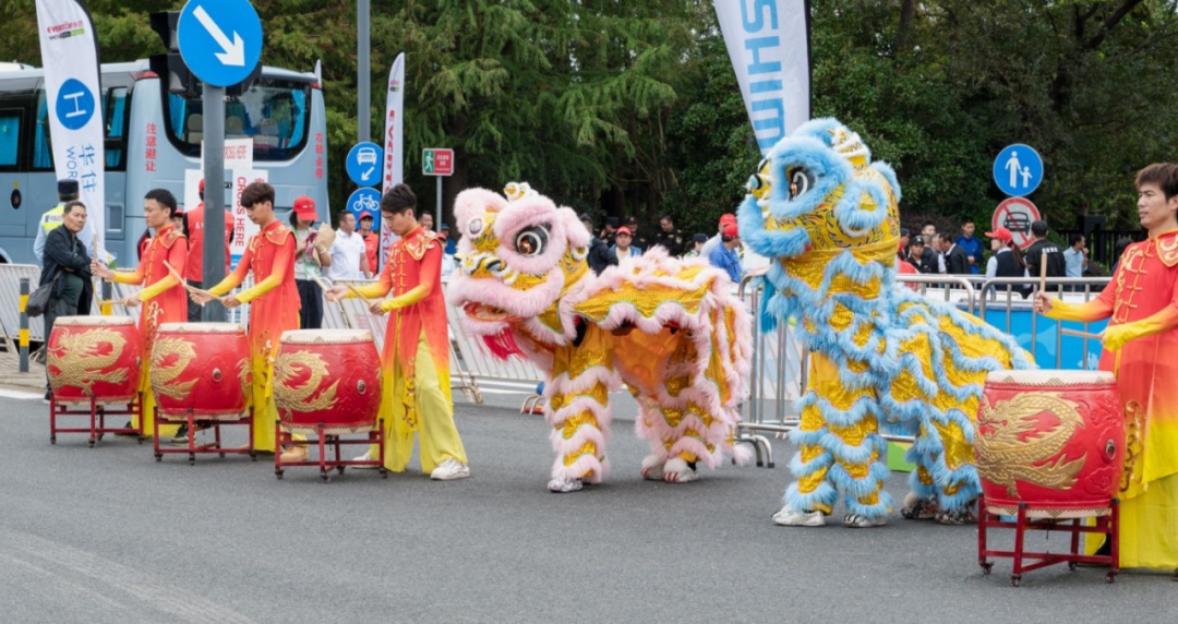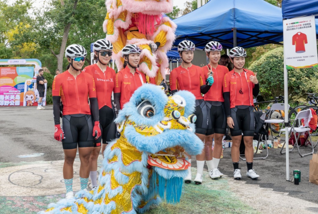地道正宗的中国舞狮受到了各国朋友的喜爱,不断有外国车手和工作人员赶来合影,就连上海长兴岛郊野公园的可爱吉祥物“长兴兄妹”也同框入镜。大家面向镜头,露出灿烂笑容,比出胜利手势,共同为此次环崇明岛女子世巡赛留下了美好回忆。