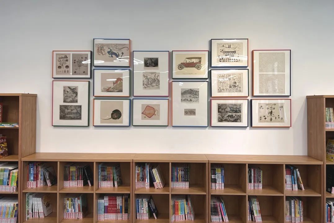 少儿阅览室墙上展示了一系列珍贵的古书插图页面,最早可以追溯到1848年莱比锡出版社出的一本百科全书中,晚近及2000年代初出版的动物图谱。内容涵盖几何体的归纳,矿石结晶面的总结,机械的制造和动物的分类,另有清末艺匠根据《山海经》描述创作的奇异动物画稿。