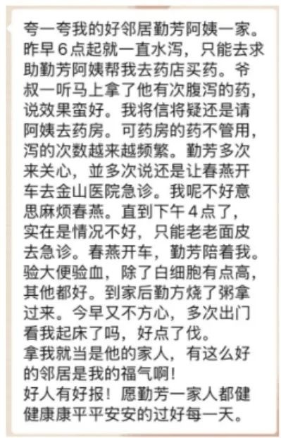 10月8日,石化街道滨二居民区的志愿者群里上演了一幕温暖故事。独居老人李阿姨在群里发了一条信息,感谢她的结对志愿者赵勤芳。 前些日子,李阿姨身体不适,药物治疗没有好转,腹泻频繁加重。得知情况后,赵勤芳立刻和女儿陪同李阿姨去医院,帮忙挂号、验血,并将她安全送回家。赵勤芳还担心李阿姨肚子饿,特意为她煮了热粥,悉心照料。如同家人般的关怀让李阿姨倍感温暖。于是,便有了这条充满感激的微信。 而在石化街道,这样的温情故事并不仅限于此。近日,家住书香门第小区的孙阿姨亲手将一面写有“敬老爱老,为老服务”的锦旗送到了山龙居委会,感谢社区对她和家人的关心照顾。 原来,孙阿姨和老伴杨叔叔都已年过八十,因家庭情况特殊,成了社区重点照顾对象。居委会安排了志愿者赵巧英与他们结对帮扶。赵巧英定期上门探望,陪他们聊天解闷,还耐心教孙阿姨使用智能手机。居委会工作人员也通过每周入户走访和电话联系,关注他们的生活和健康状况。每当工作人员上门时,孙阿姨总是感慨道:“你们就像我的家人一样,照顾得这么细致。” 同样给社区带来温暖的还有家住山龙新村的王美芳。此前,她在龙凯街发现一名走失小孩,第一时间报警求助,并在等待警方到来的过程中安抚孩子,四处打听线索。最终,在警方和居委会的协助下,顺利帮孩子找到了家人。当看到孩子安然无恙时,家长热泪盈眶,连连感谢。 近年来,石化街道推行“爱心点名”行动,打造志愿服务中心,实行公益积分制。截至目前,石化街道已拥有注册志愿者约2万人,其中“爱心点名”志愿者752人,自“爱心点名2.0”版本推出以来,累计完成志愿服务点名60余万人次。在这群志愿者中,涌现出众多感人的人物故事,如全国文明家庭龚建强一家,用爱和信念唤醒了生命的奇迹;全国红十字先进志愿者毛俊,捐献骨髓救助陌生人;中国好人苑志强,因感动于“爱心点名”,毅然捐赠唯一住房,并签署遗体捐献协议……这些平凡而动人的善举,如点点星光,汇聚成了石化街道“文明之光”。 记者:陈忆文、杨季峰 通讯员:赖薇牟、裴元欢 编辑:俞萝寅