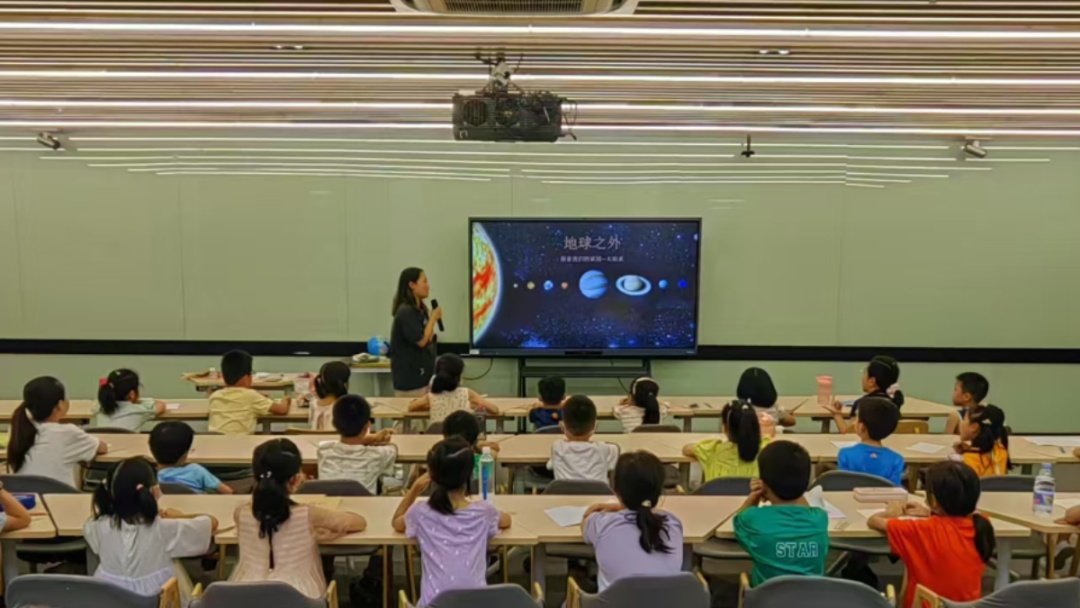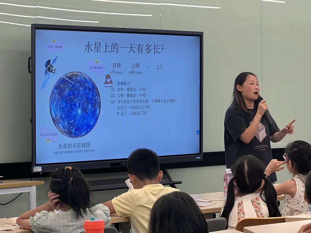 当天,“漕韵·知了”童心读书会的天文小课堂为孩子们带来了另一个全新的探索。天文学博士苗老师带领孩子们仰望星空,借助天文知识,打开了更广阔的视野。孩子们在课堂上通过计算地球与太阳距离的等比例缩放、观察磁力线的形状,以及探讨水星一天的长度,学习着复杂但有趣的天文知识。孩子们还参与了角色扮演,有的扮演太阳,有的扮演水星、地球,通过演绎天体运动的方式更深入地理解天体运动的原理。