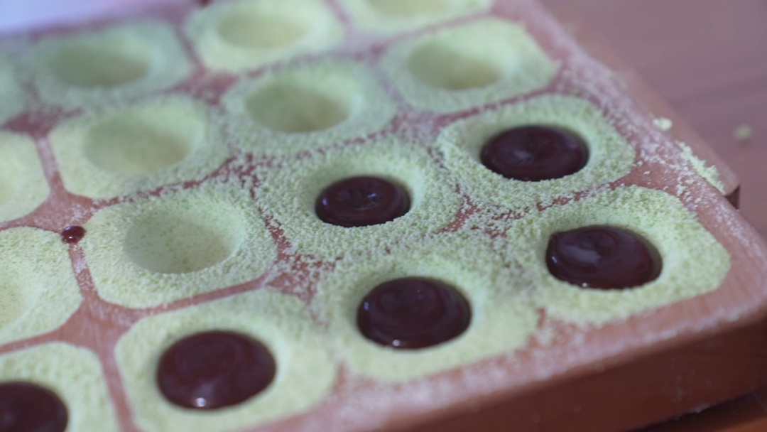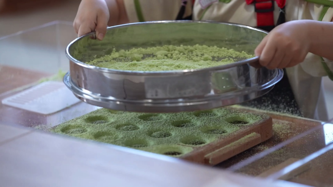 叶榭软糕,将研磨米粉筛入特制模具,加入红豆、猪油调制而成的馅料,筛粉覆盖、刮面脱模,最后经过20分钟的隔水蒸煮,一块块松软香甜的叶榭软糕新鲜出炉。
