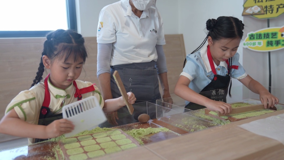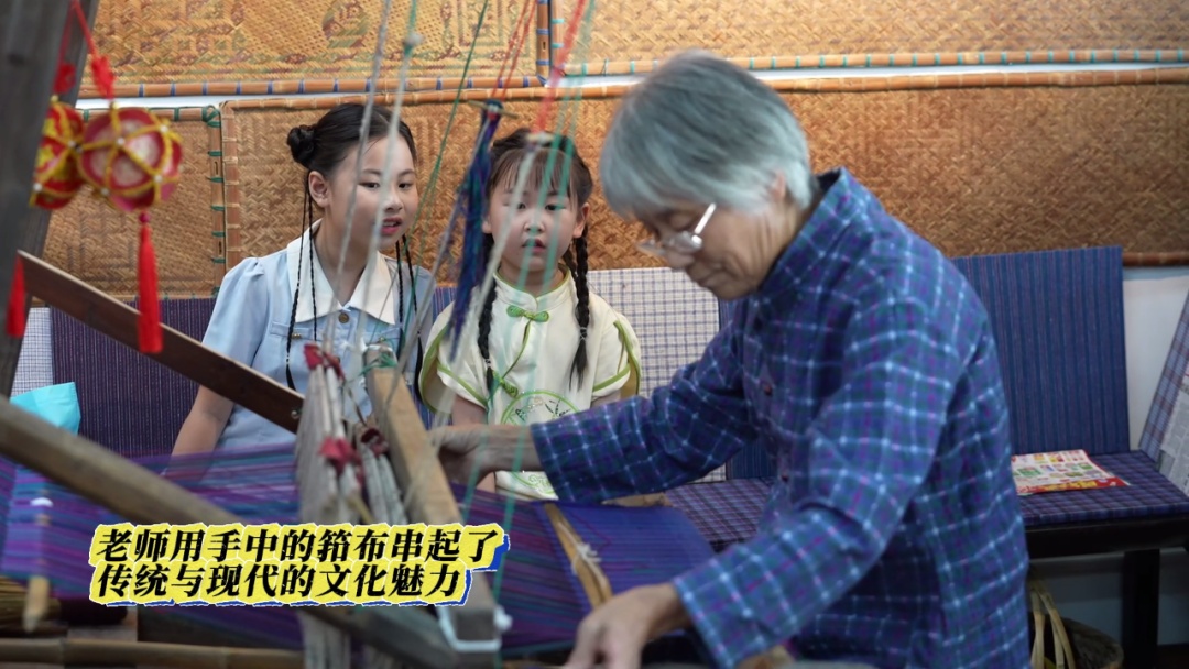 叶榭竹编工艺传承人何新良手把手教授“小种子”叶榭竹编;叶榭筘布纺织技艺传承人彭梅华现场演绎叶榭筘布技艺。