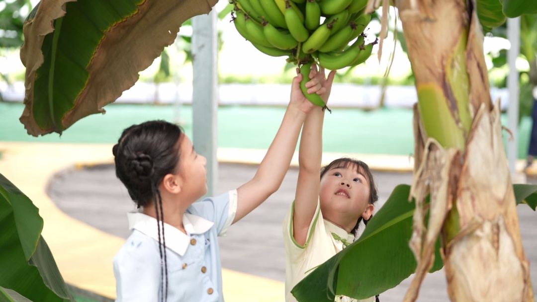 “小种子”和妹妹一起喂了小羊羔,体验了水果采摘。