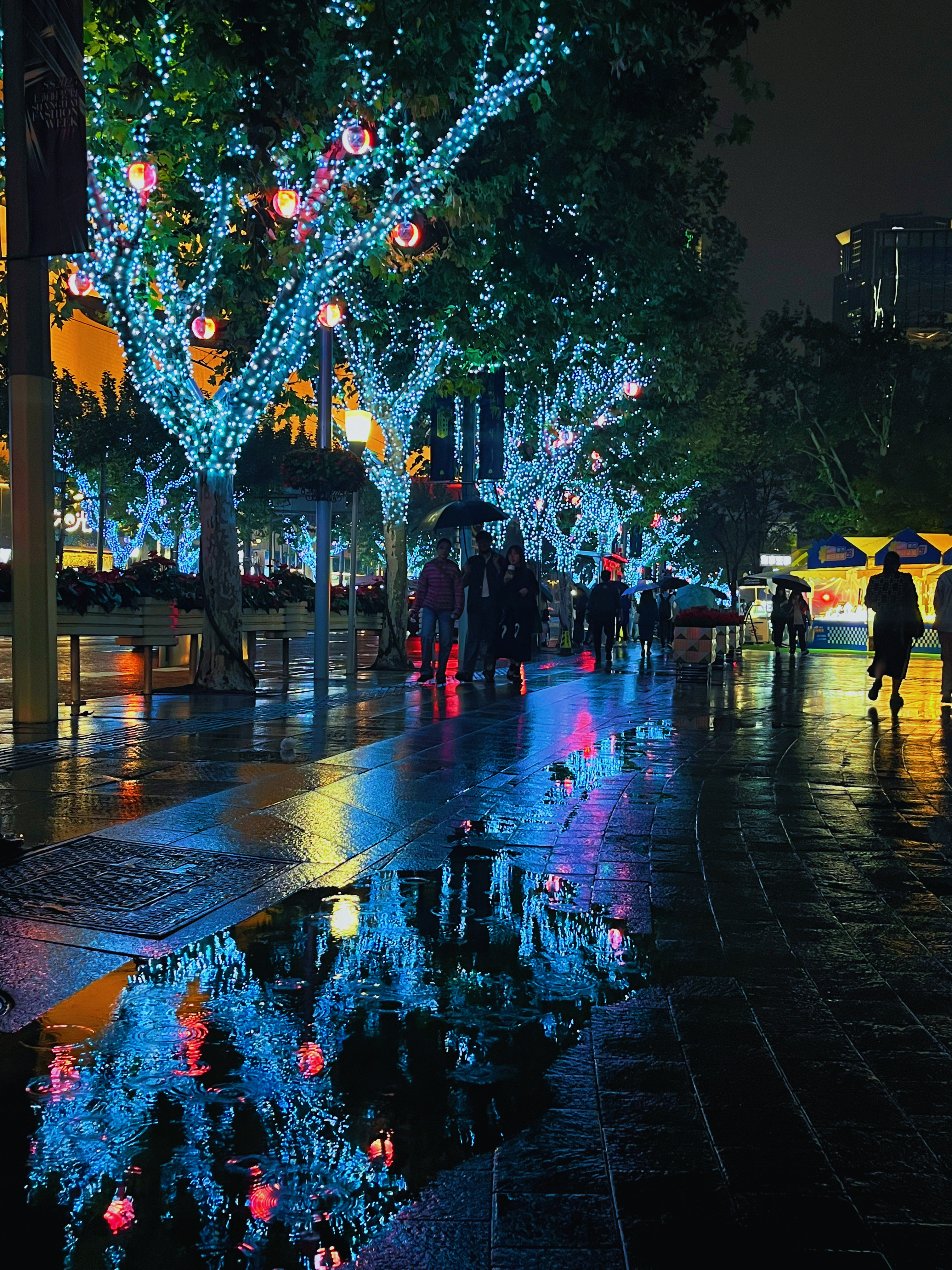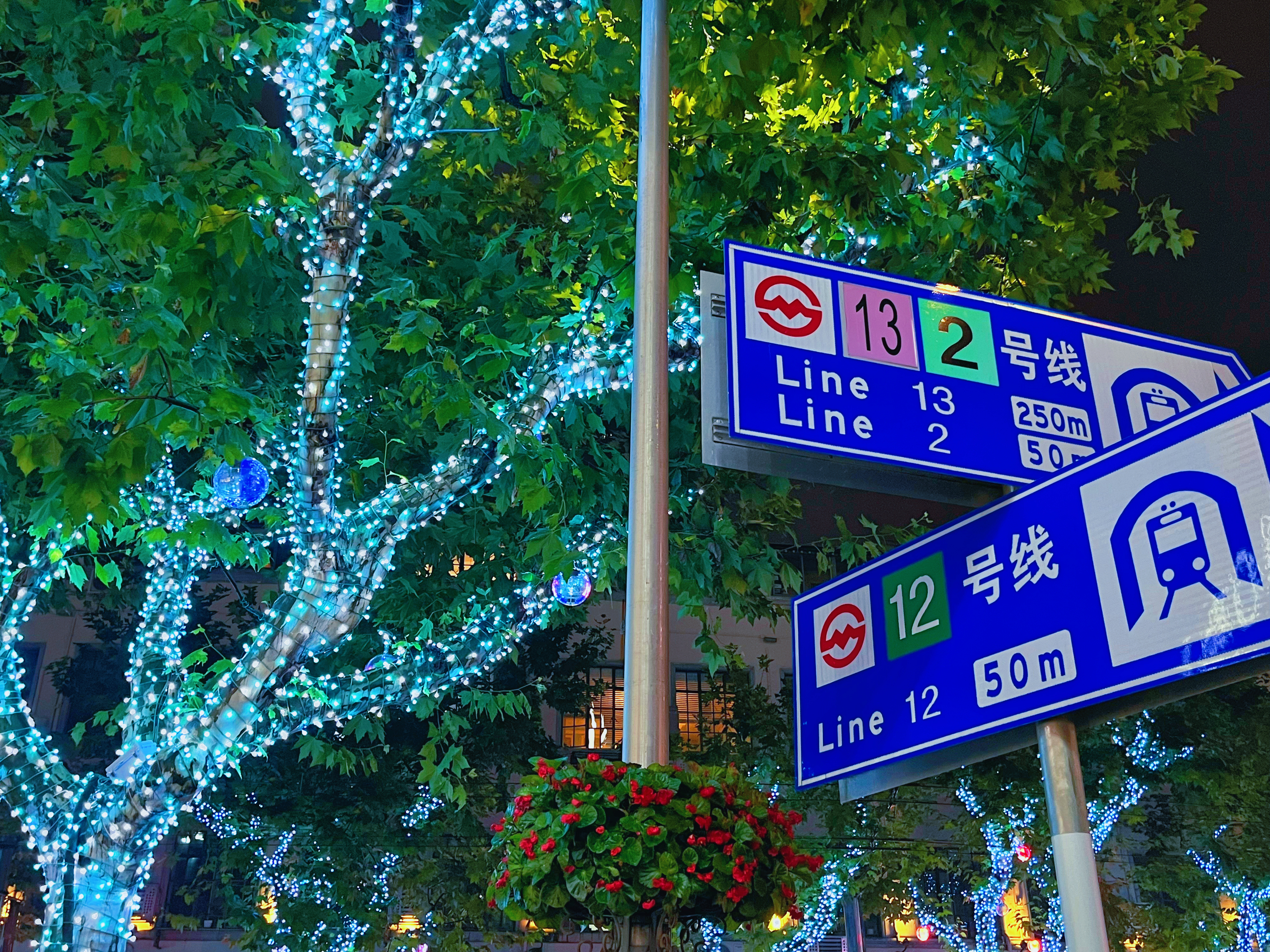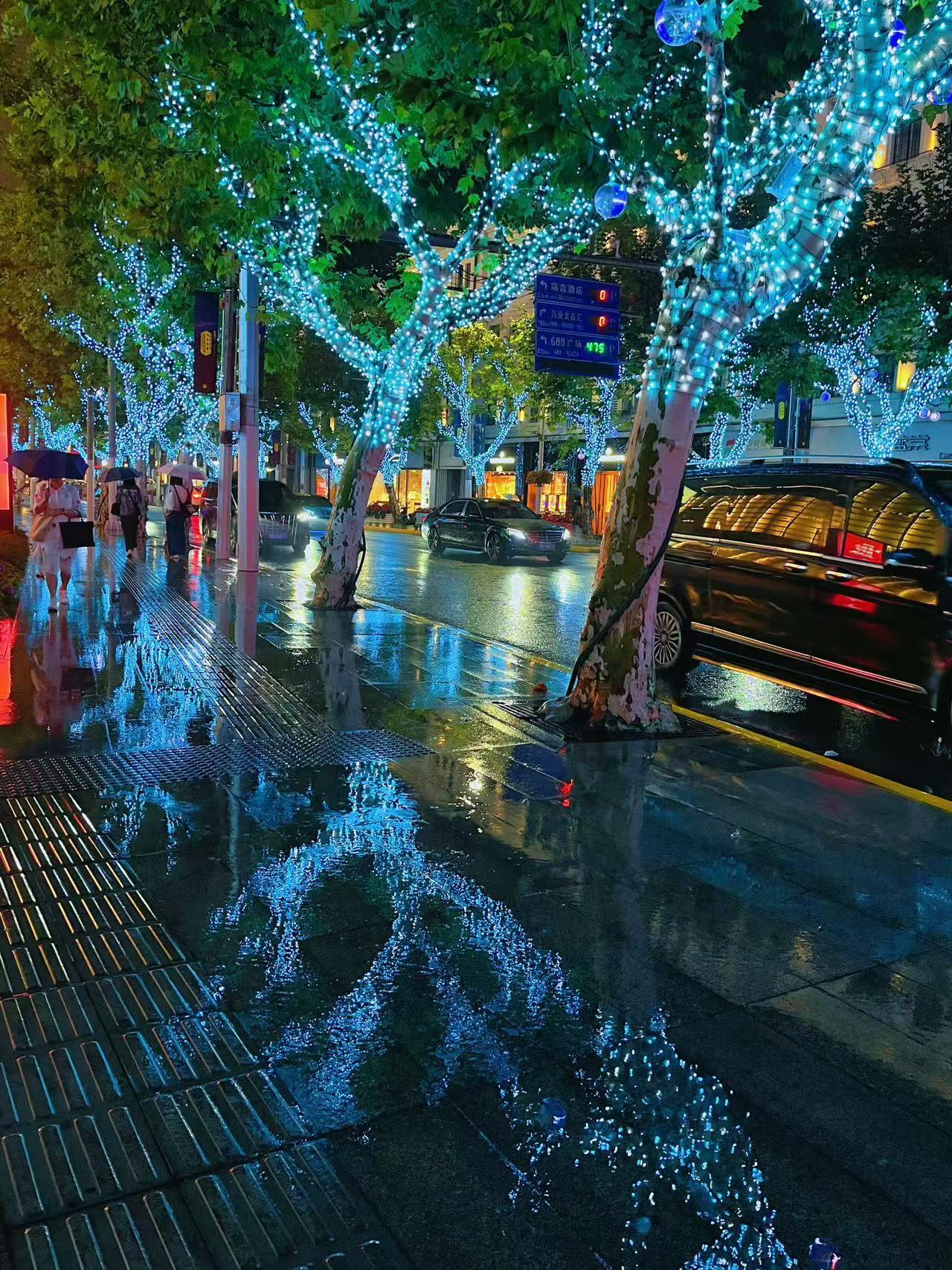 “原本只有嘉里中心到恒隆广场之间这段是华丽的蓝色星空,最近好像南京西路一整条街都变得‘哇蓝’的,晚上走在路上也太有氛围感了吧!”