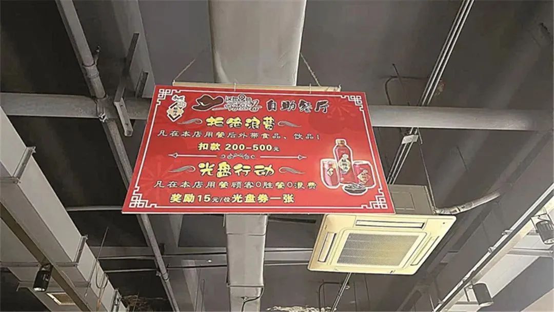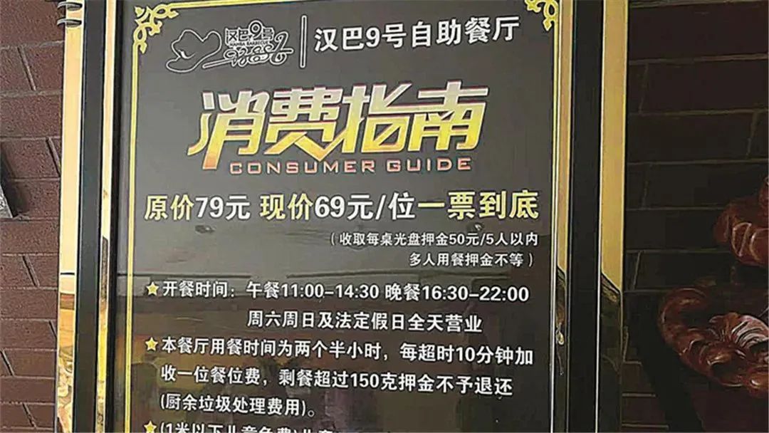 记者在餐厅门口看到消费指南中写着:收取每桌光盘押金50元,5人内多人用餐押金不等;本餐厅用餐时间为两个半小时,每超时10分钟加收一位餐位费,剩余超过150克押金不予退还。同时,记者在餐厅内还看到一处提醒:凡在本店用餐后外带食品、饮品,扣款200元至500元。