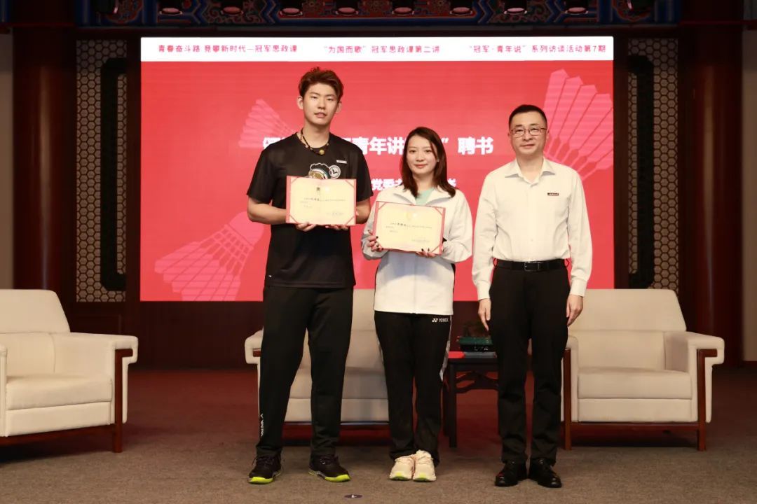 活动现场,上海体育大学党委书记李崟,为两位冠军运动员,颁发了“绿瓦青年讲师团”聘书,希望两位冠军运动员,能在今后的冠军青年说课堂上,继续用体育人的方式诠释奋斗青春,努力为建设教育强国,体育强国,健康中国贡献力量。