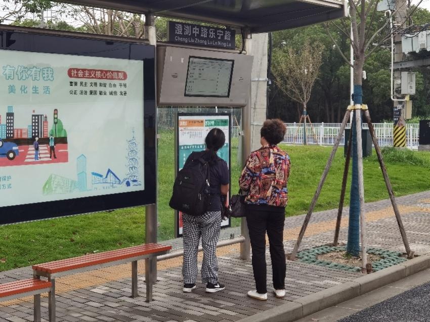 位于信息栏上方的电子站牌实时显示着班次到站时间,为乘客提供更多便捷。“没有电子站牌就不知道车什么时候来,干等着很着急。现在知道下一班车什么时候到,等车时就不焦虑了,还可以计算换乘轨交的时间,方便多了。”市民陈女士说。