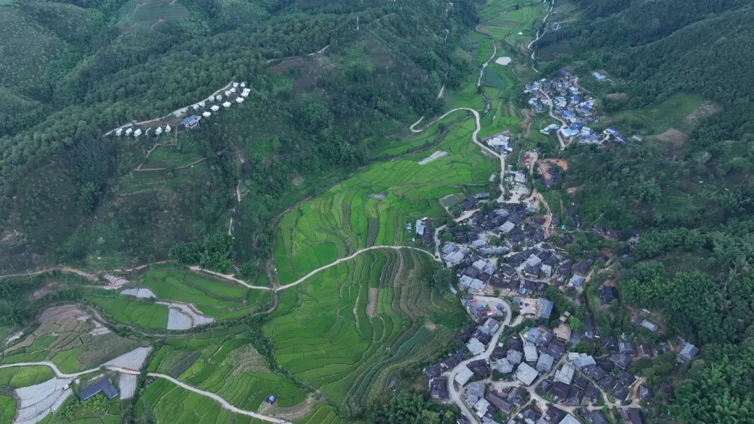 这里,青山绿水环绕,蓝天白云映衬着绿油油的稻田;