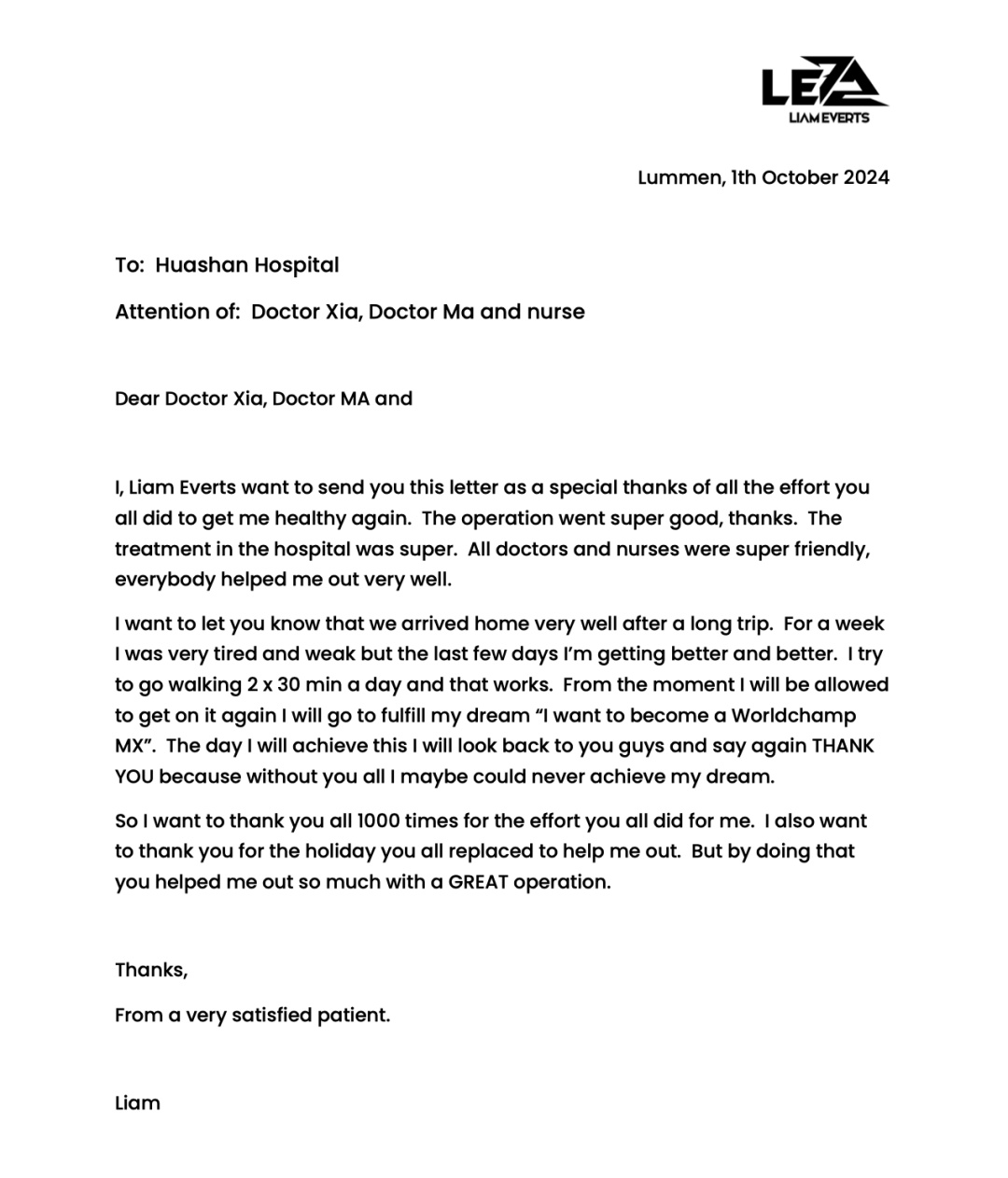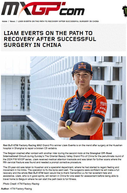 摩托车手Liam Everts写给华山骨科团队的感谢信