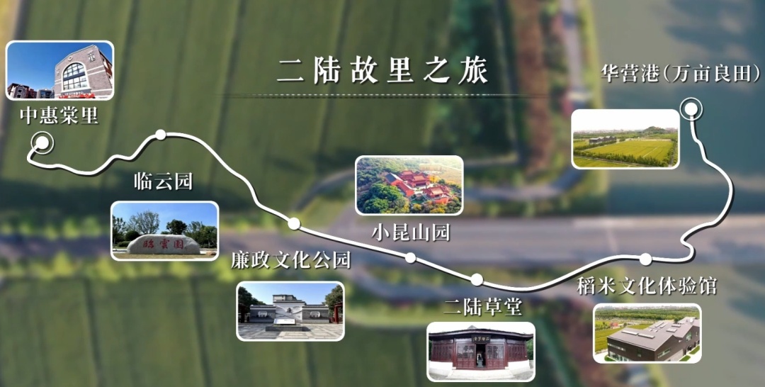 中惠棠里——临云园——廉政文化公园——小昆山园——二陆草堂——稻米文化体验馆——华营港(万亩良田)