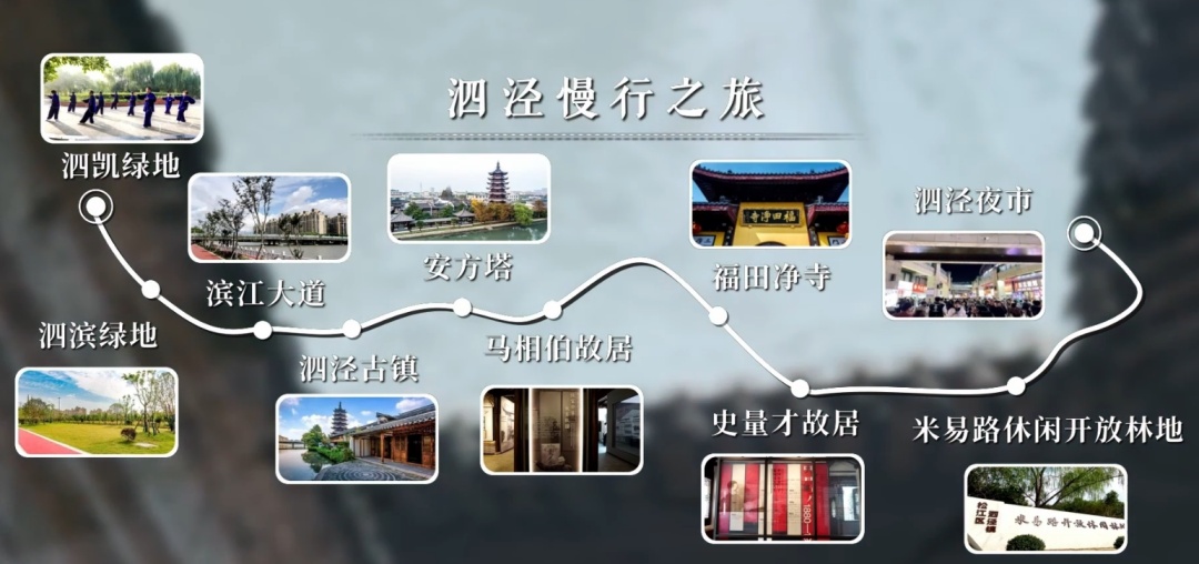 泗凯绿地——泗滨绿地——滨江大道——泗泾古镇——安方塔——马相伯故居——福田净寺——史量才故居——米易路休闲开放林地——泗泾夜市
