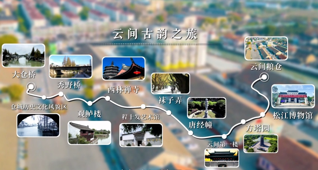 大仓桥——仓城历史文化风貌区——秀野桥——观鲈楼——西林禅寺——程十发艺术馆——袜子弄——唐经幢——云间第一楼——方塔园——松江博物馆——云间粮仓