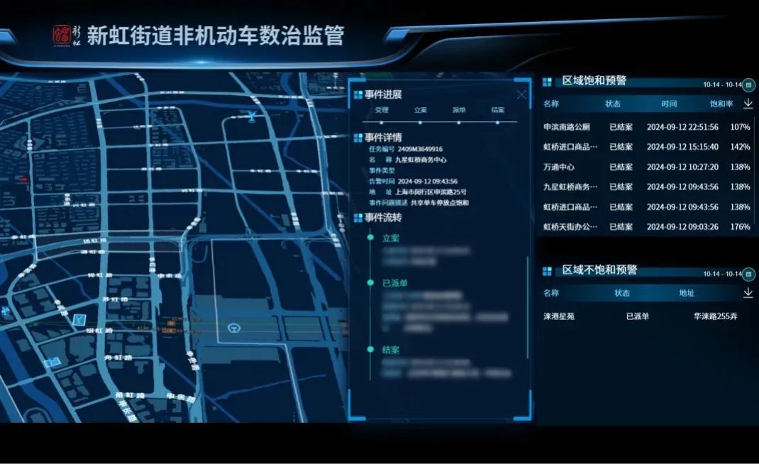 比如,9月12日9时43分,监管平台发现位于九星虹桥商务中心的共享单车点位出现了车辆过饱和预警,平台于10点30分自动生成工单推送至相关片区网格进行快速处置。当天10时48分,仅用18分钟,该工单处置完成后便自动结案。