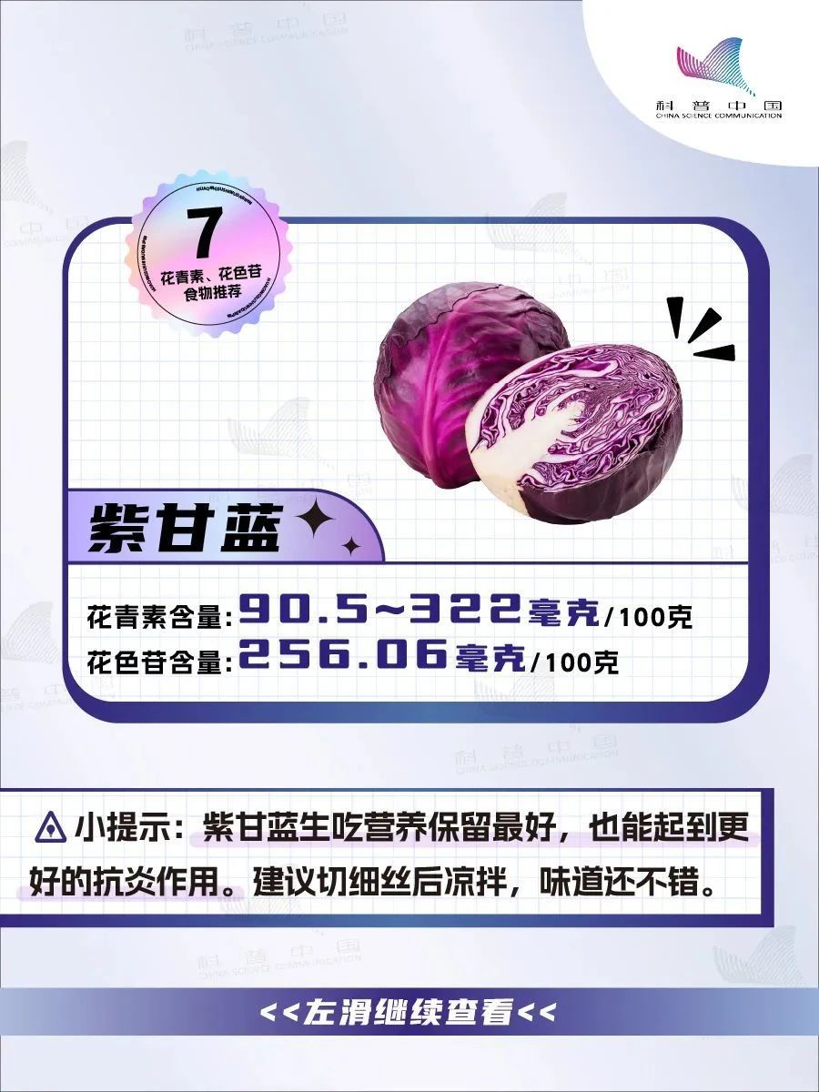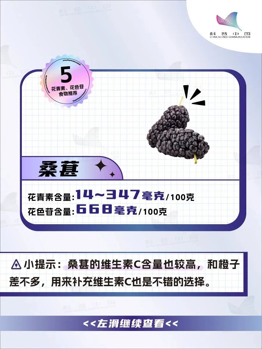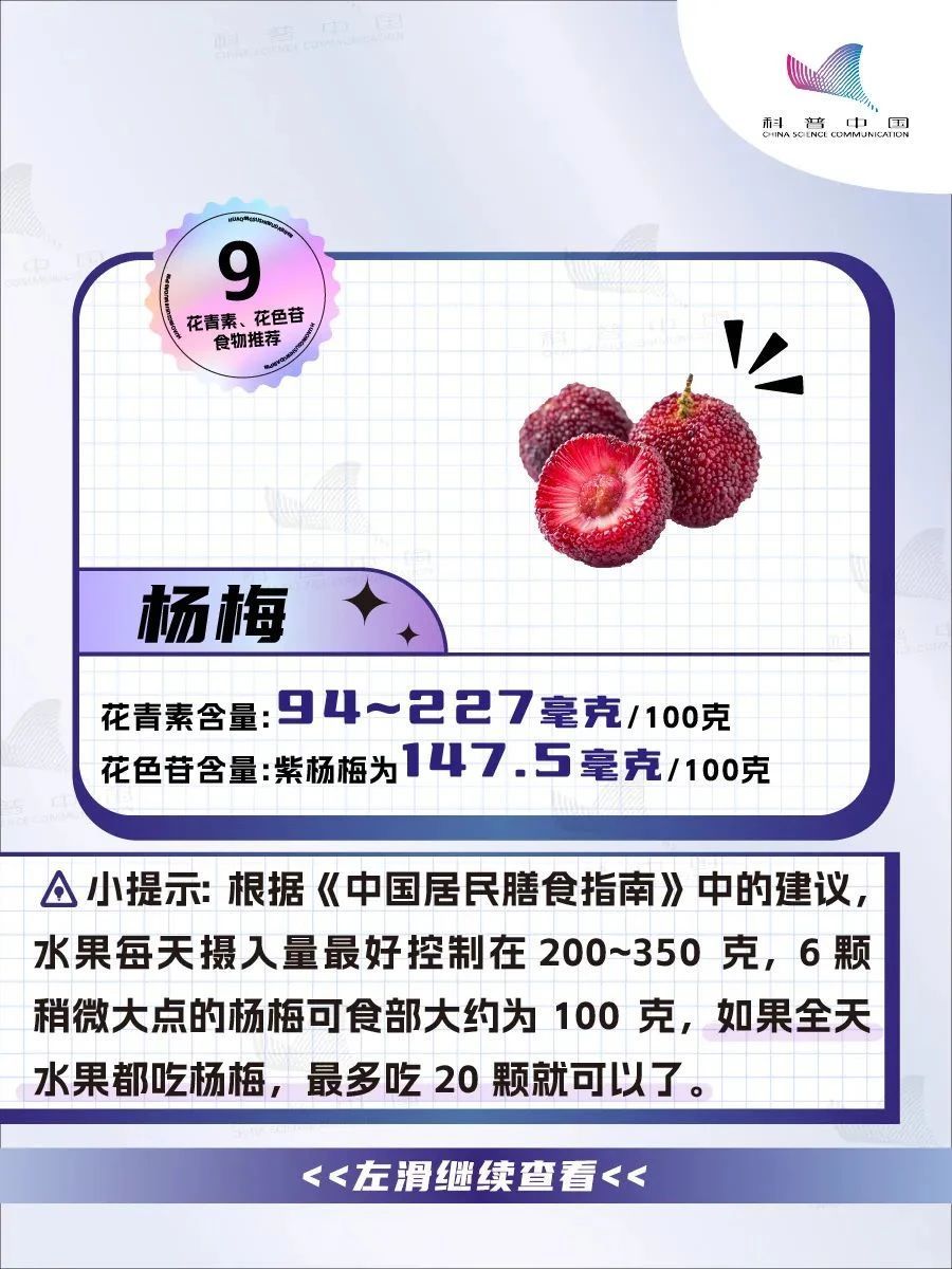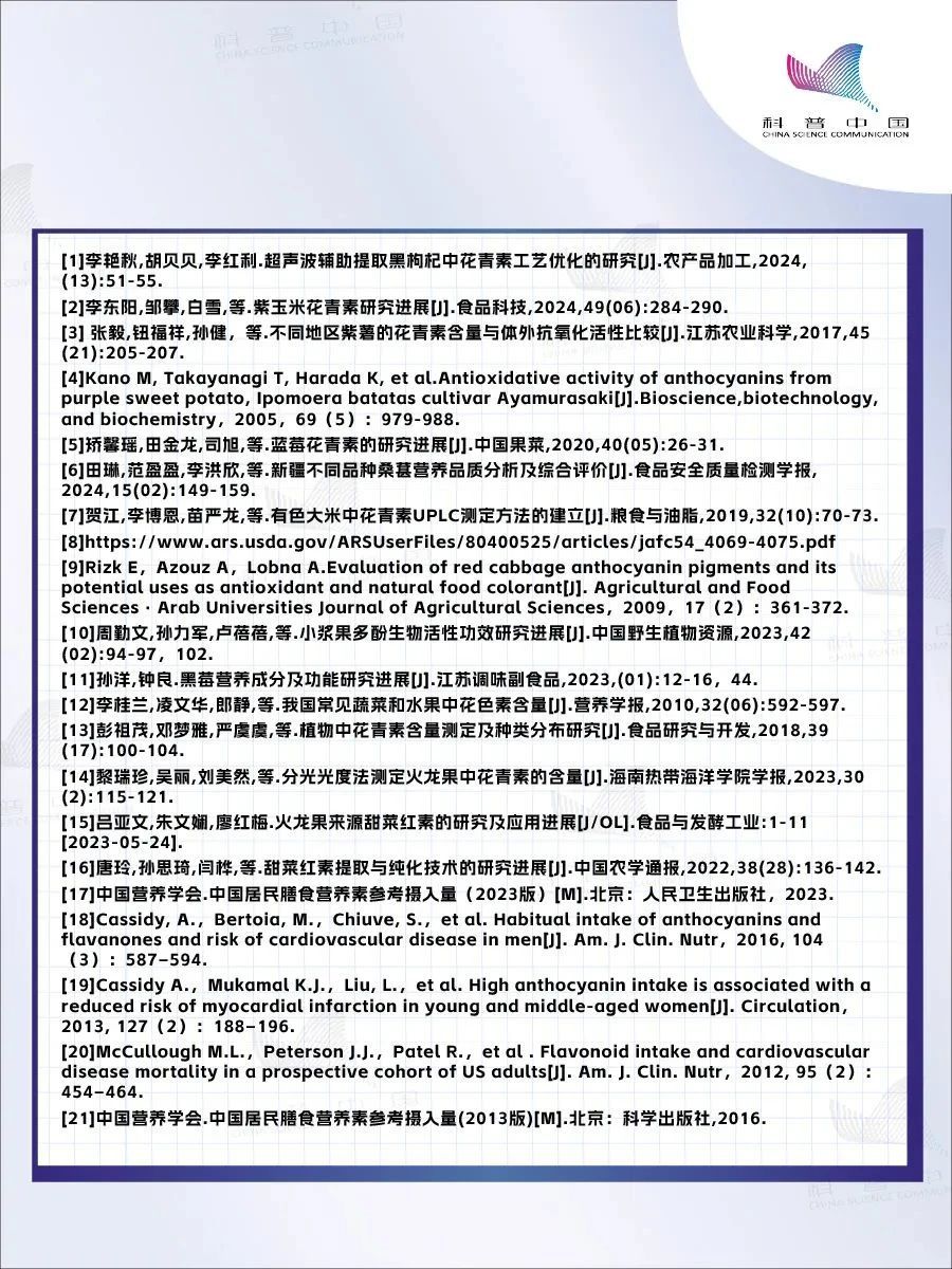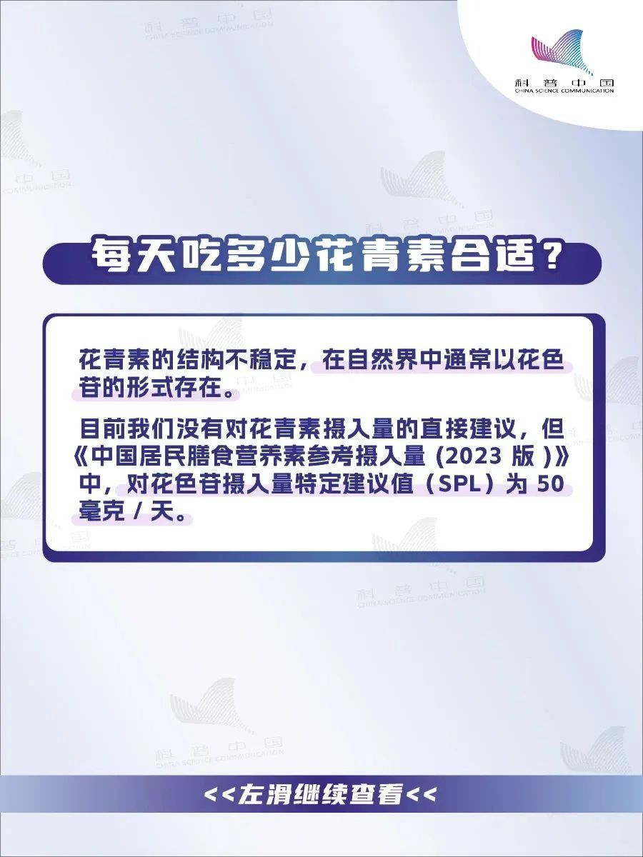 目前我们没有对花青素摄入量的直接建议,但《中国居民膳食营养素参考摄入量(2023版)》中,对花色苷摄入量特定建议值(SPL)为50毫克/天。