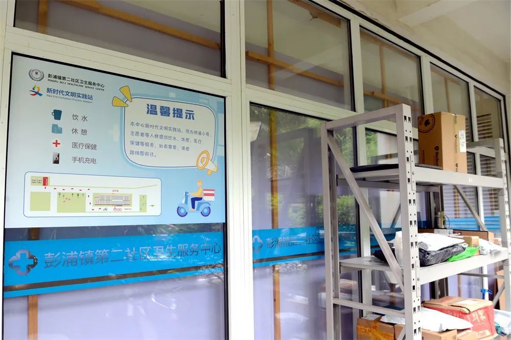 这间小小的驿站是彭浦镇第二社区卫生服务中心新近打造的新时代文明实践站,为快递员、外卖员、环卫工人等户外工作人群提供短暂的休息场所。