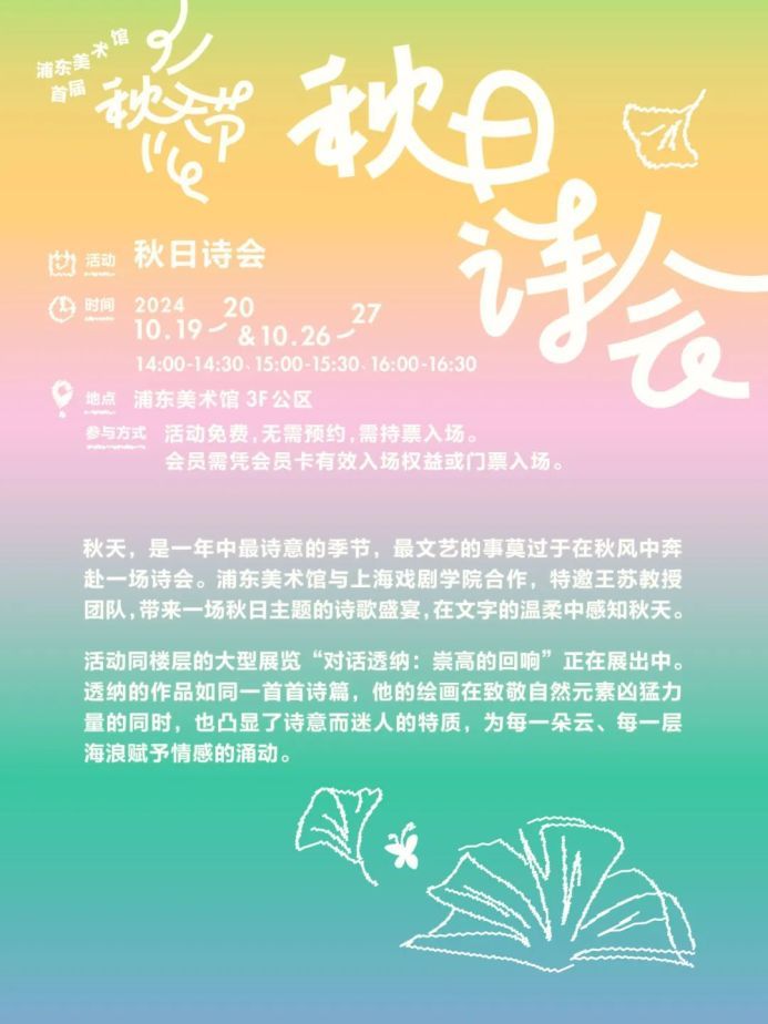 上海的秋天,如同“光之画家”透纳笔下唯美的水彩画,流淌着柔和的光线和浪漫的色彩。10月19日,浦东美术馆首届秋天节即将启幕,邀请市民共享一场充满艺术感的秋日之约。活动将为期两周,快来一场秋日Citywalk!