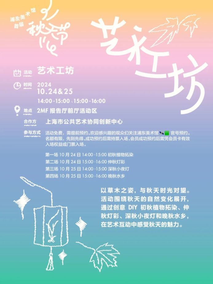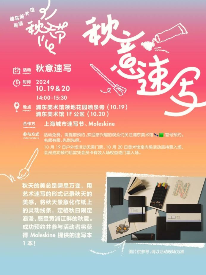 参与方式:发布小红书笔记分享你的浦美秋天节体验,定位选择“浦东美术馆”,笔记话题带上#浦东美术馆和#秋天节,向工作人员出示笔记即可参与抽奖。奖品数量有限,先到先得。