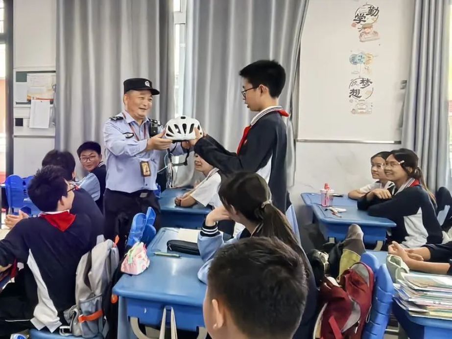 其间,警察叔叔还重点向同学们讲授了倡导佩戴自行车安全头盔的理念,并发放了《学生交通安全倡议信》,勉励孩子们将班会学习到的安全知识传递给家人,做好交通安全的“小小宣传员”。班会结束时,警察叔叔向骑自行车的同学发放了公益头盔。王同学拿到了头盔非常开心:“今后骑自行车将始终遵守交通法规,不闯红灯、不逆行,还要主动戴好头盔,保护‘头’等安全。”