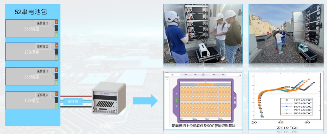 (1)储能电池的安全性和一致性问题的快速检测技术,处于国内领先水平。通常储能电池采用大容量的磷酸铁锂电池,其电压平台范围大,使得在常态工况条件下难以识别电池的内部状态(包括老化、一致性、安全性)。通过采用无损电化学阻抗谱(EIS)技术及多种基于云端大数据的AI算法,已实现对电池数据的实时检测。具体参数包括:1)单次EIS检测最快仅需30秒,且完成模组和电池包所有单体的检测仅需10—30分钟;2)首创开发了AI驱动的ECM模型和DRT分析工具,通过人工智能融合驱动的方法,实现SOH(State of Health,健康状态)的快速估计,误差不超过3%;3)利用EIS特征和非监督机器学习方法,实现电池多维度一致性分选;4)通过特殊激励工况,能够不开包检测电池的安全状态,包括多维度一致性检测、早期内短路检测、BusBar异常检测等;5)构建了云端大数据平台,用于实时监控电池模组和电池包的检测数据。