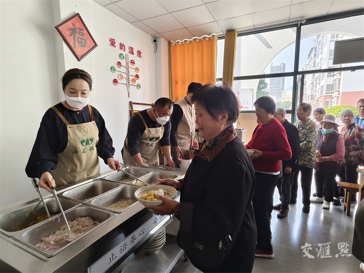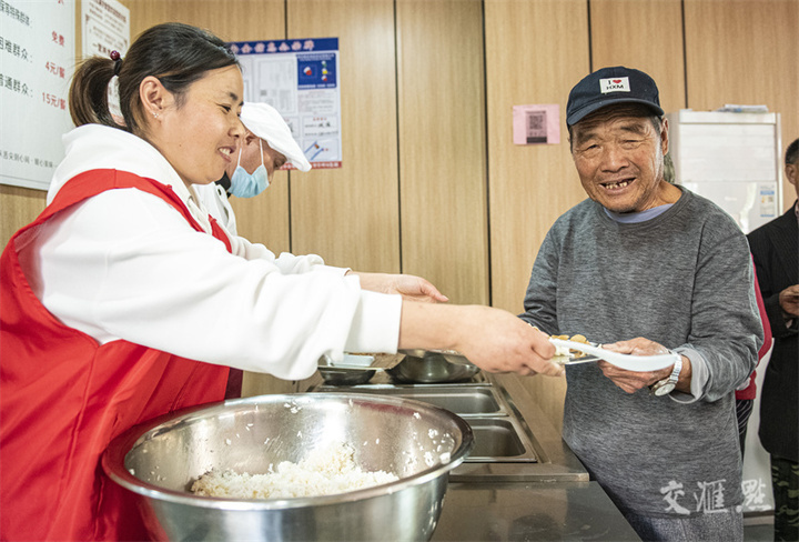 10月9日,宿迁市宿城区支口街道康堡社区老年食堂,志愿者给老人打菜端汤,热情陪伴老人就餐。徐江海摄 视觉江苏网供图