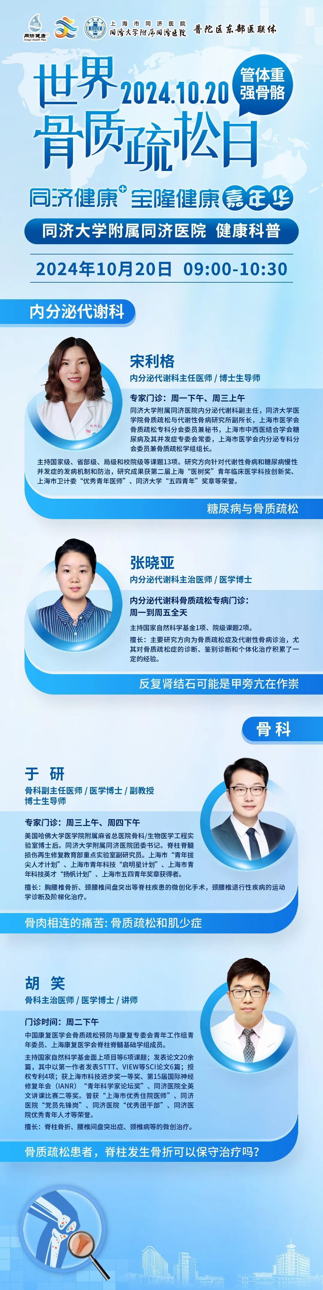 同济大学附属同济医院将于2024年10月20日上午9:00进行【世界骨质疏松日】科普直播。来自内分泌代谢科和骨科的四位专家将带来相关科普知识。