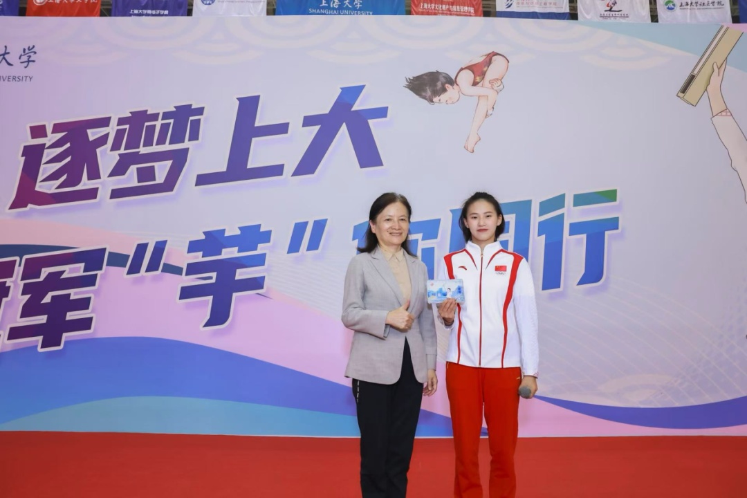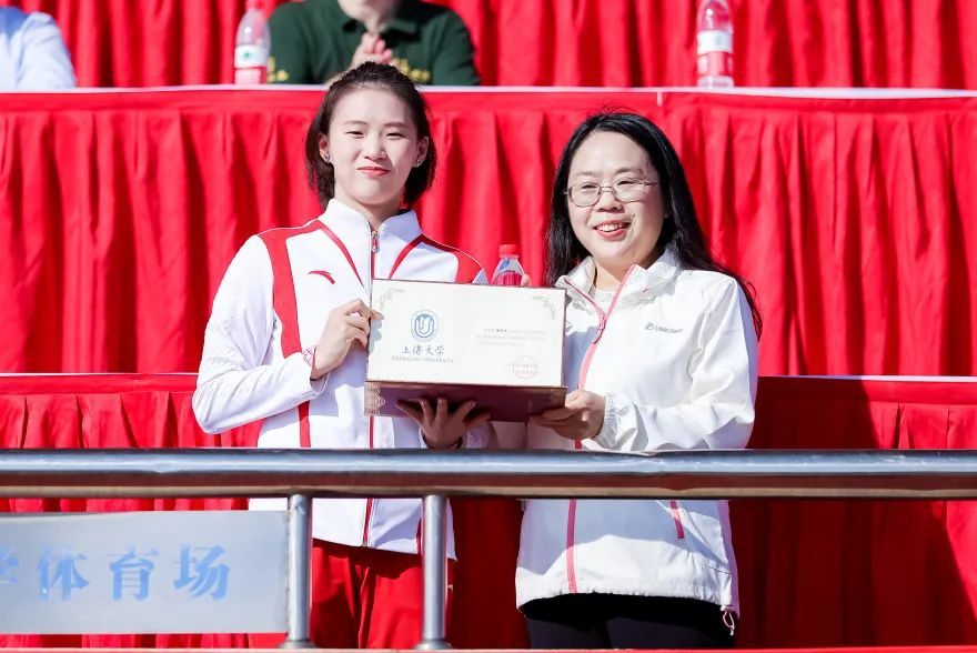 上海大学副校长张建华为陈芋汐颁发“上海大学校园体育精神传播大使”聘书。